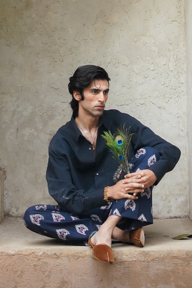A classic black tailored button-up shirt with a relaxed fit, showcasing Aomi's 'peacocks in love' motif detailed on an oversized pocket, crafted with fine resham and tilla embroidery.