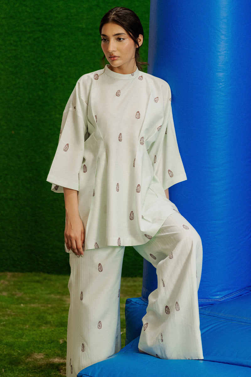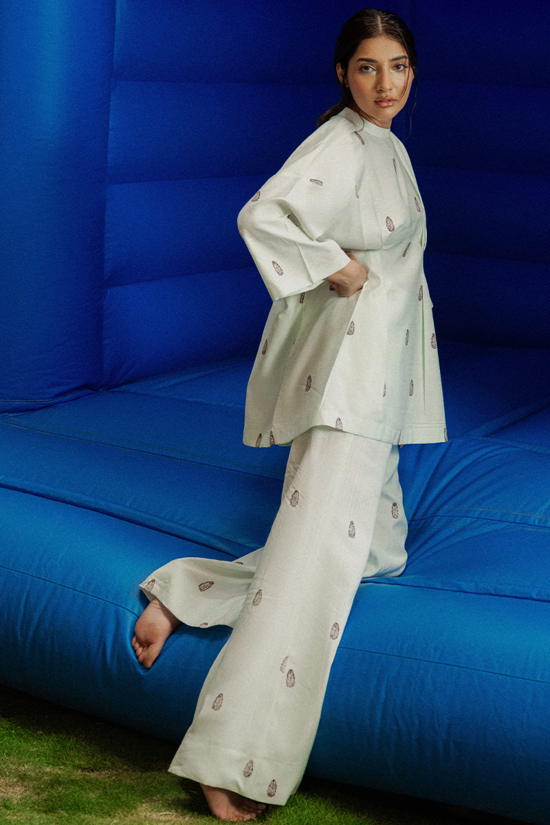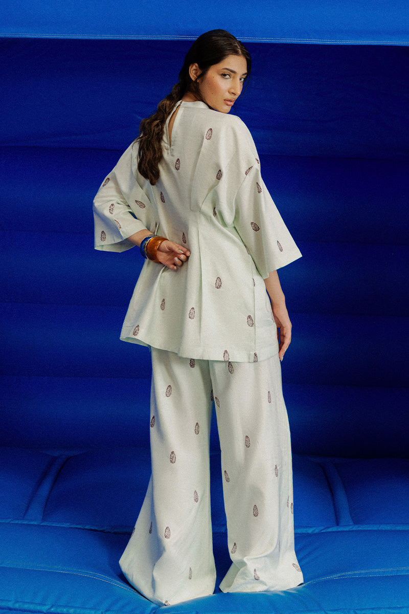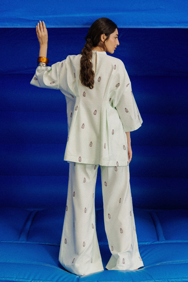 Tailored trousers with a slight flare, hand crafted block print detailing of Aomi's cypress tree motif.