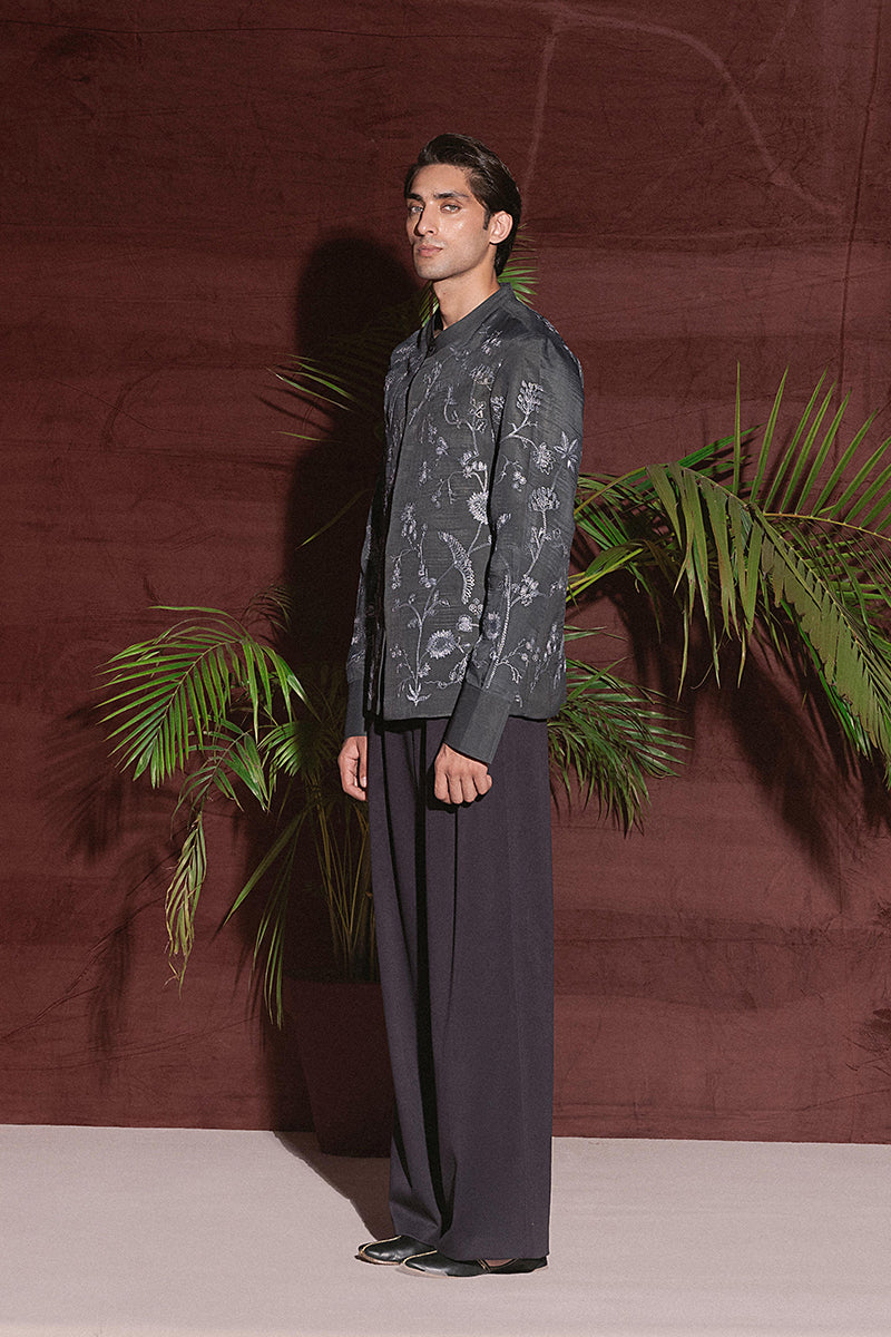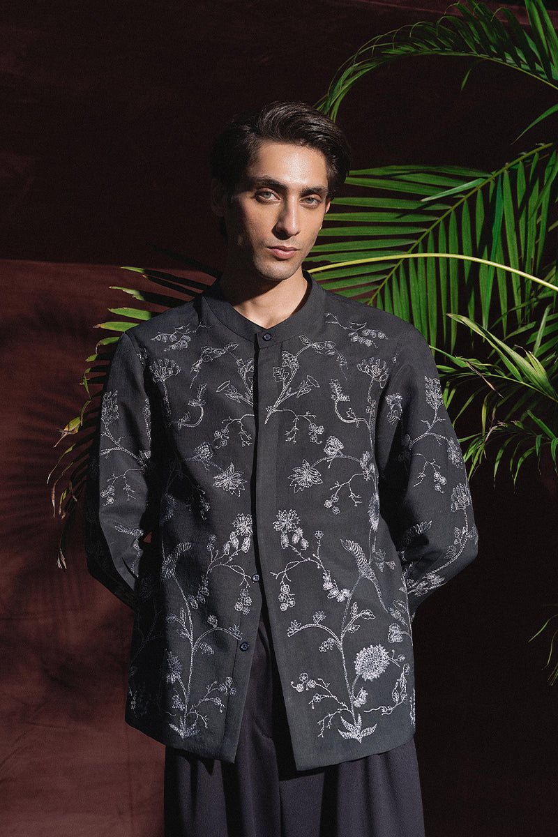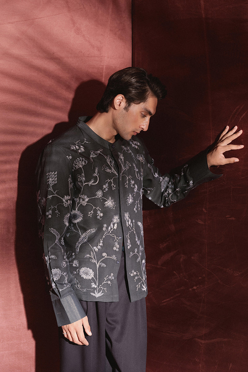 Extensively hand drawn and hand-embroidered using artisanal kantha techniques referencing elements from vintage south asian festive wear laid all over an easy resort cut shirt.
