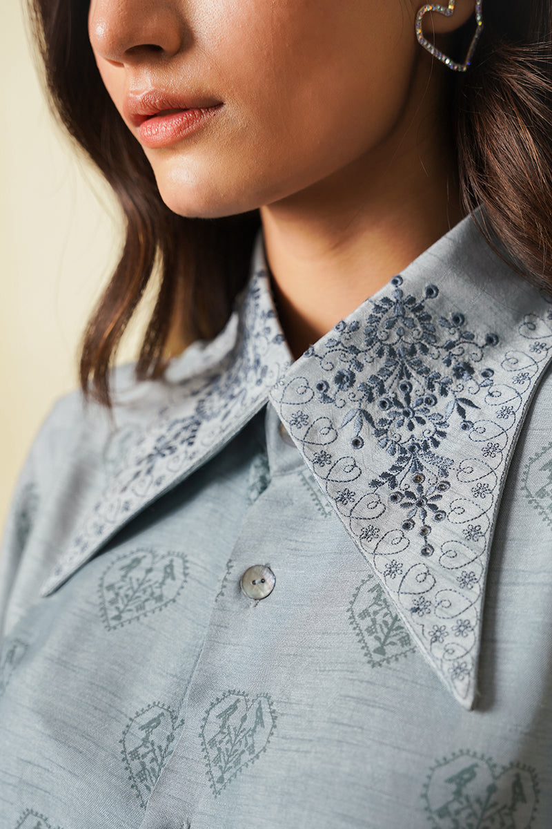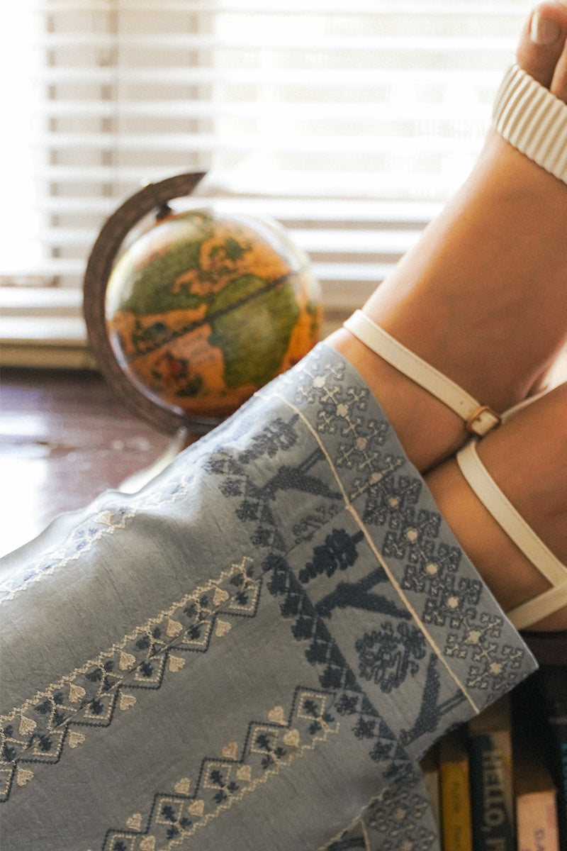 A tailored ice-blue shirt and trouser set detailed with screen printed patterns of Aomi's Love Birds along with intricate schifli embroidery on the collar. Paired with straight cut trousers with cross-stitch, hand-drawn, embroidered patterns.