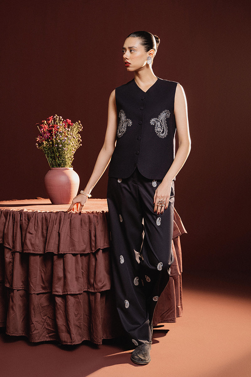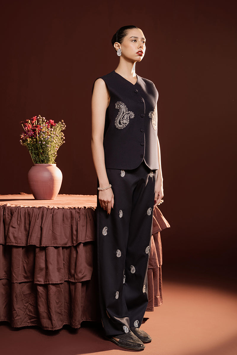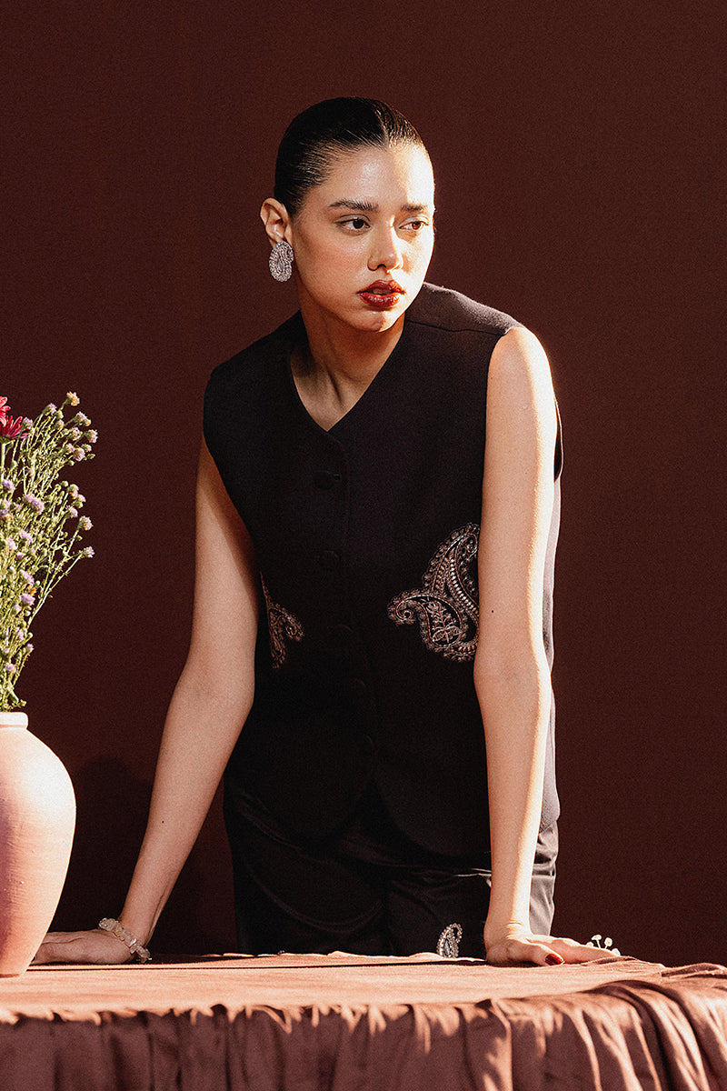 Tailored waistcoat with hand-drawn paisley motifs embroidered in subtle tones of champagne, silver and blush.