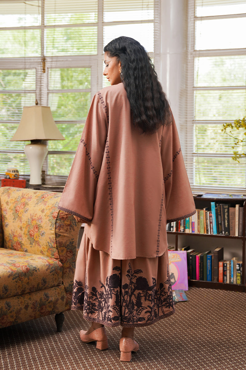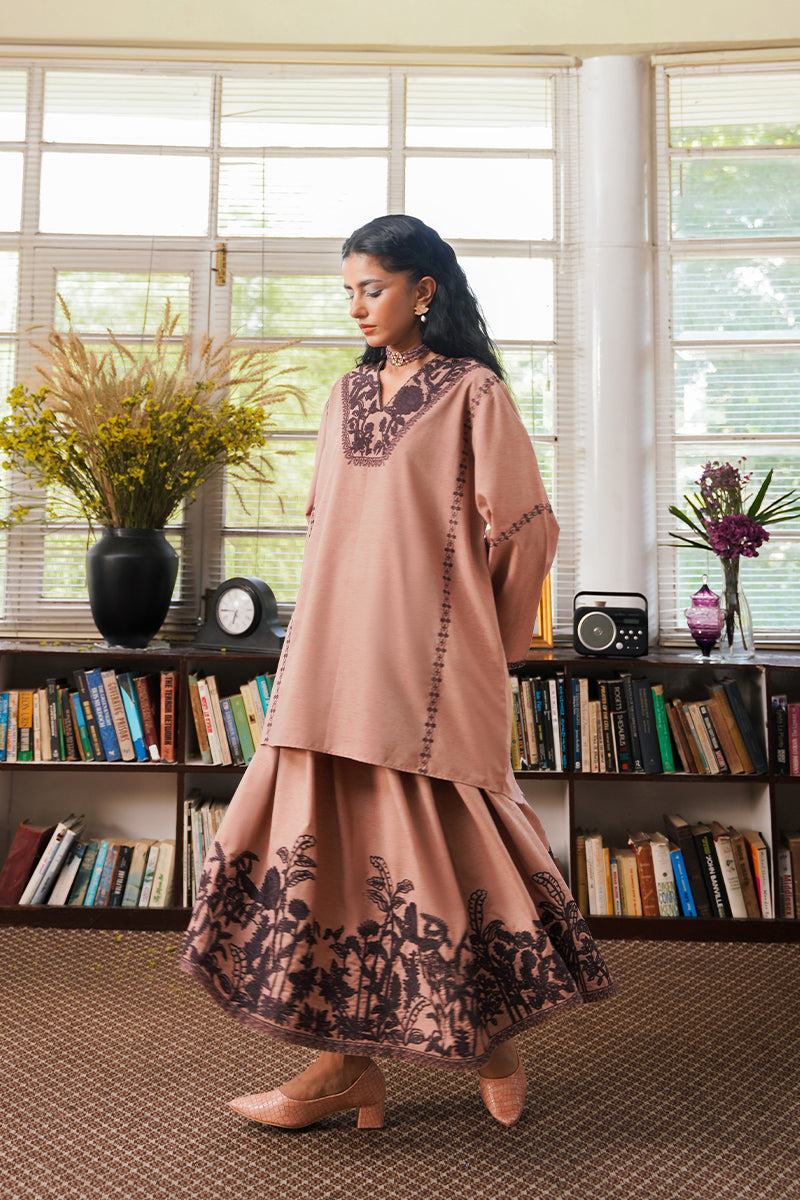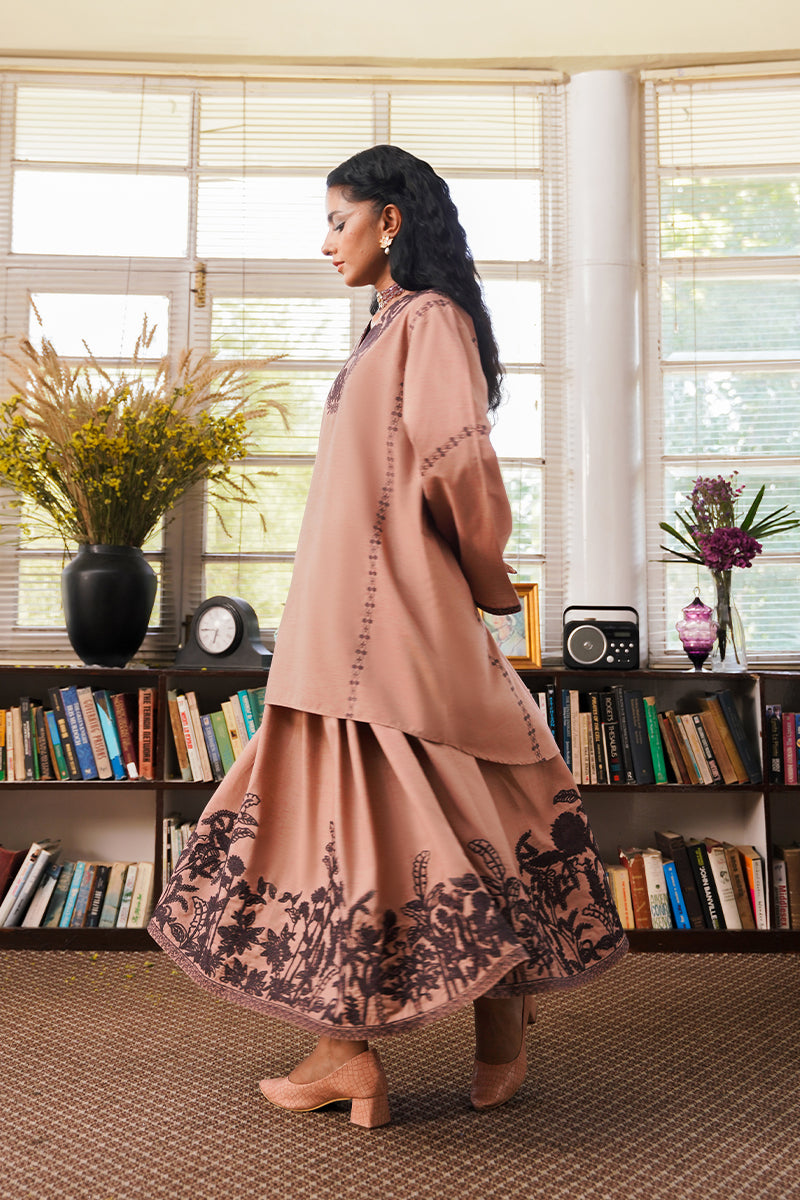 An effortless blouse and skirt set in a tea pink shade detailed with intricate hand-drawn dori workmanship referencing Aomi's Mystic Jungle on the neckline and bottom and further accentuated with lace and embroidered detailing.