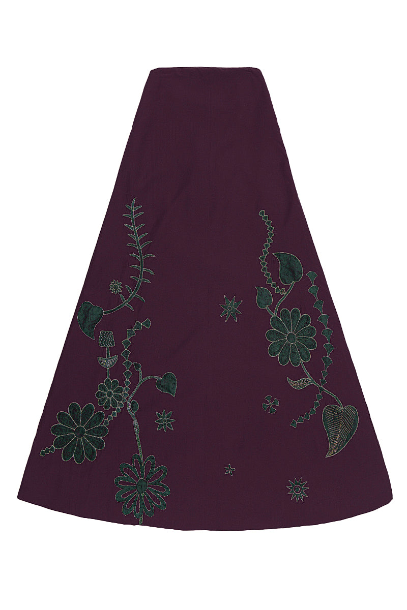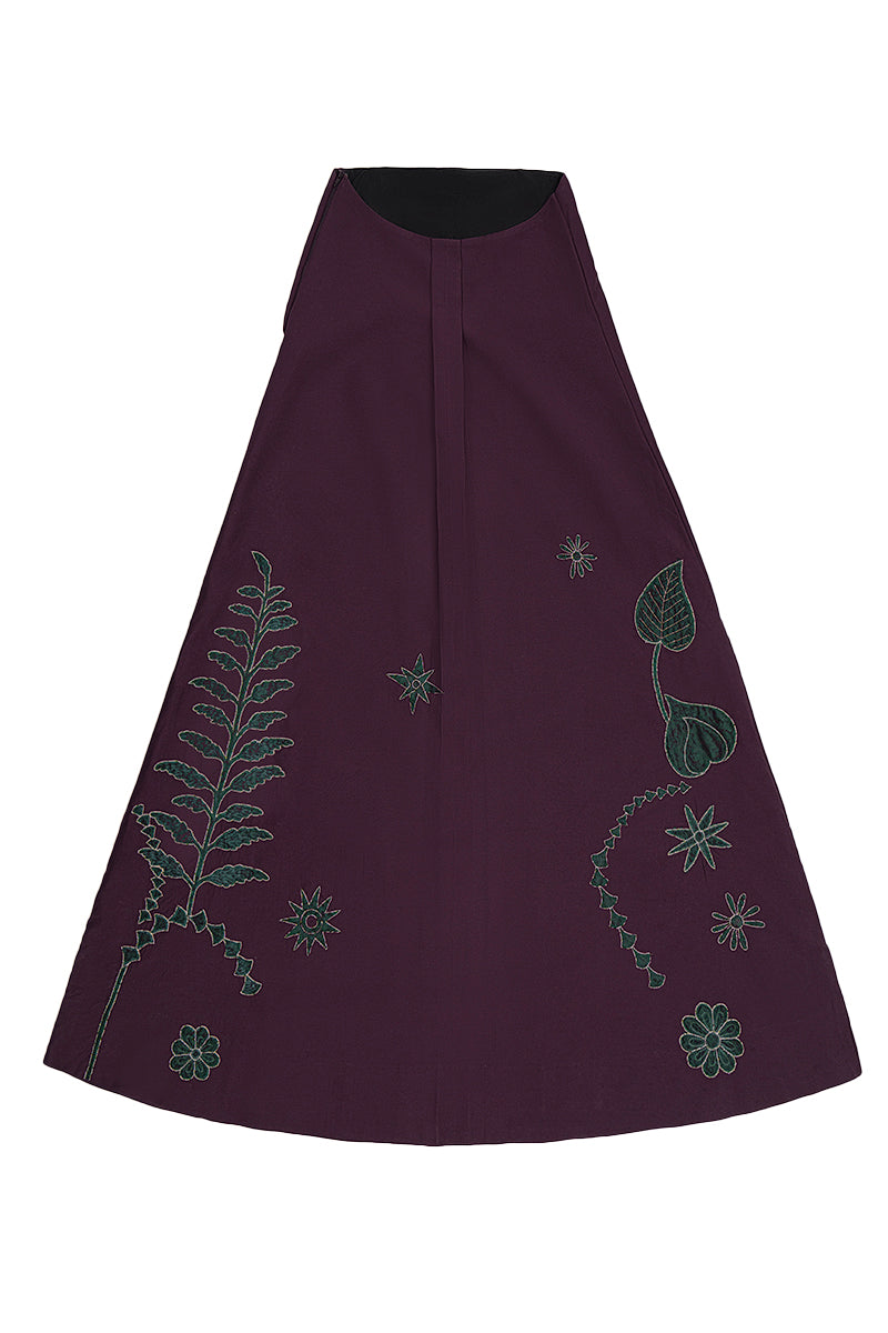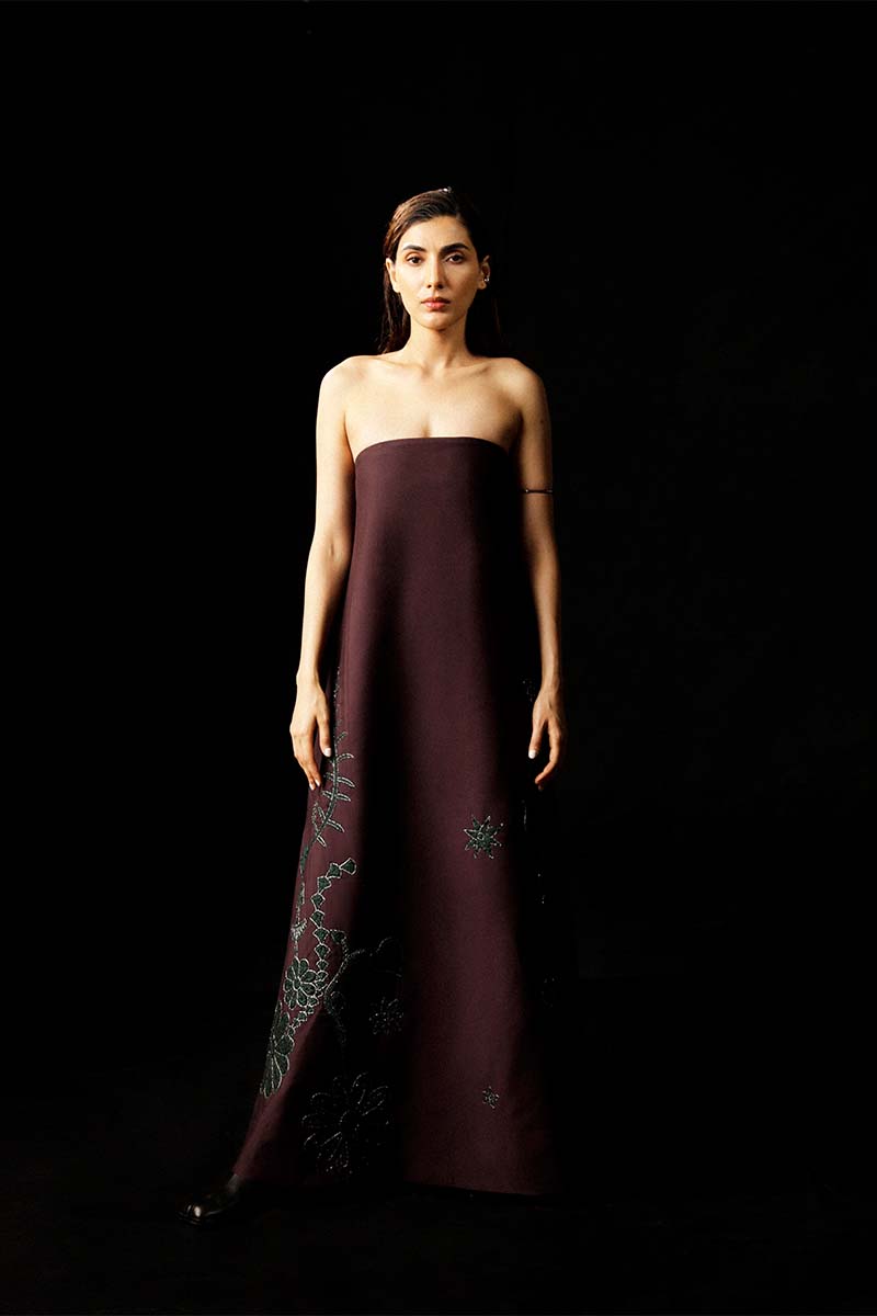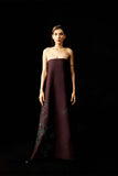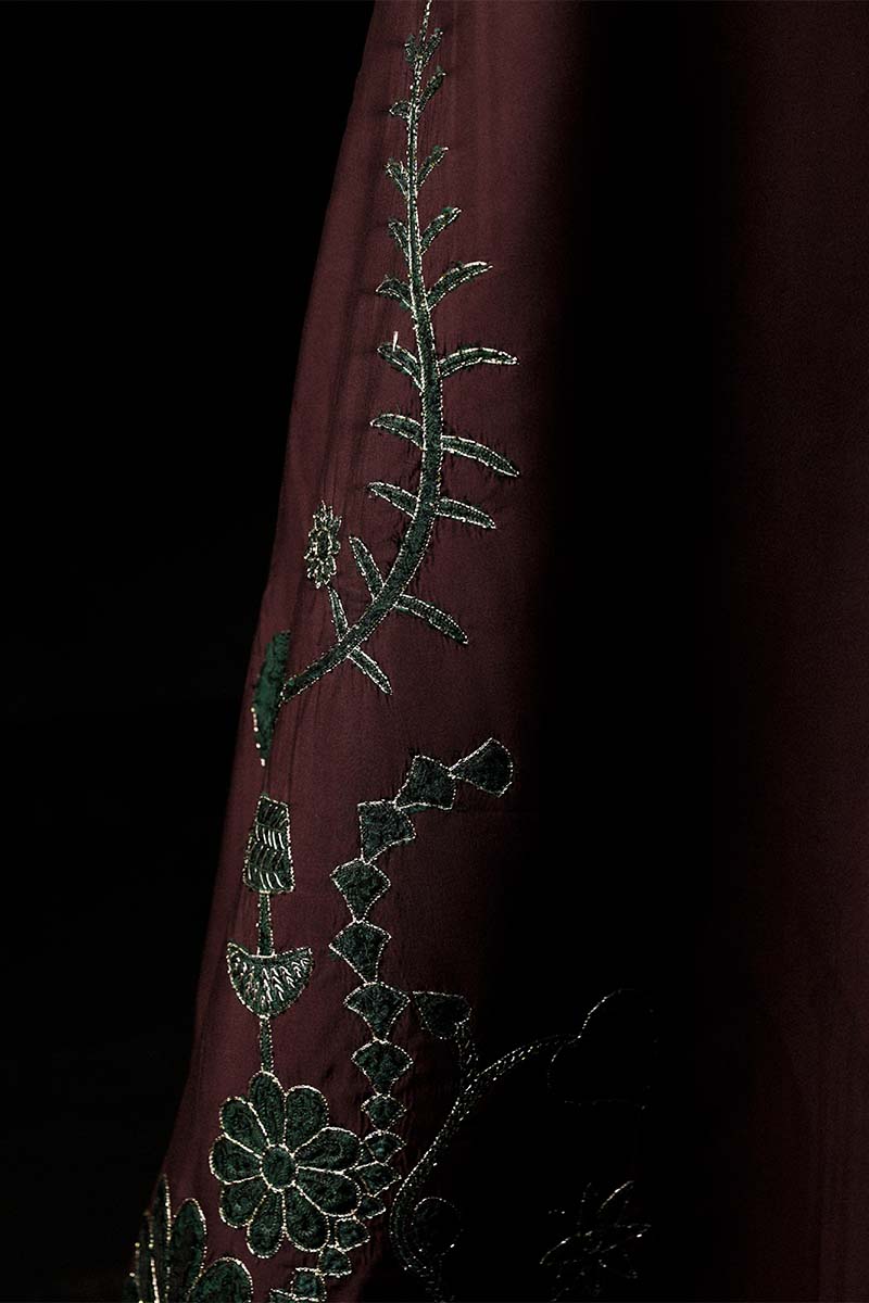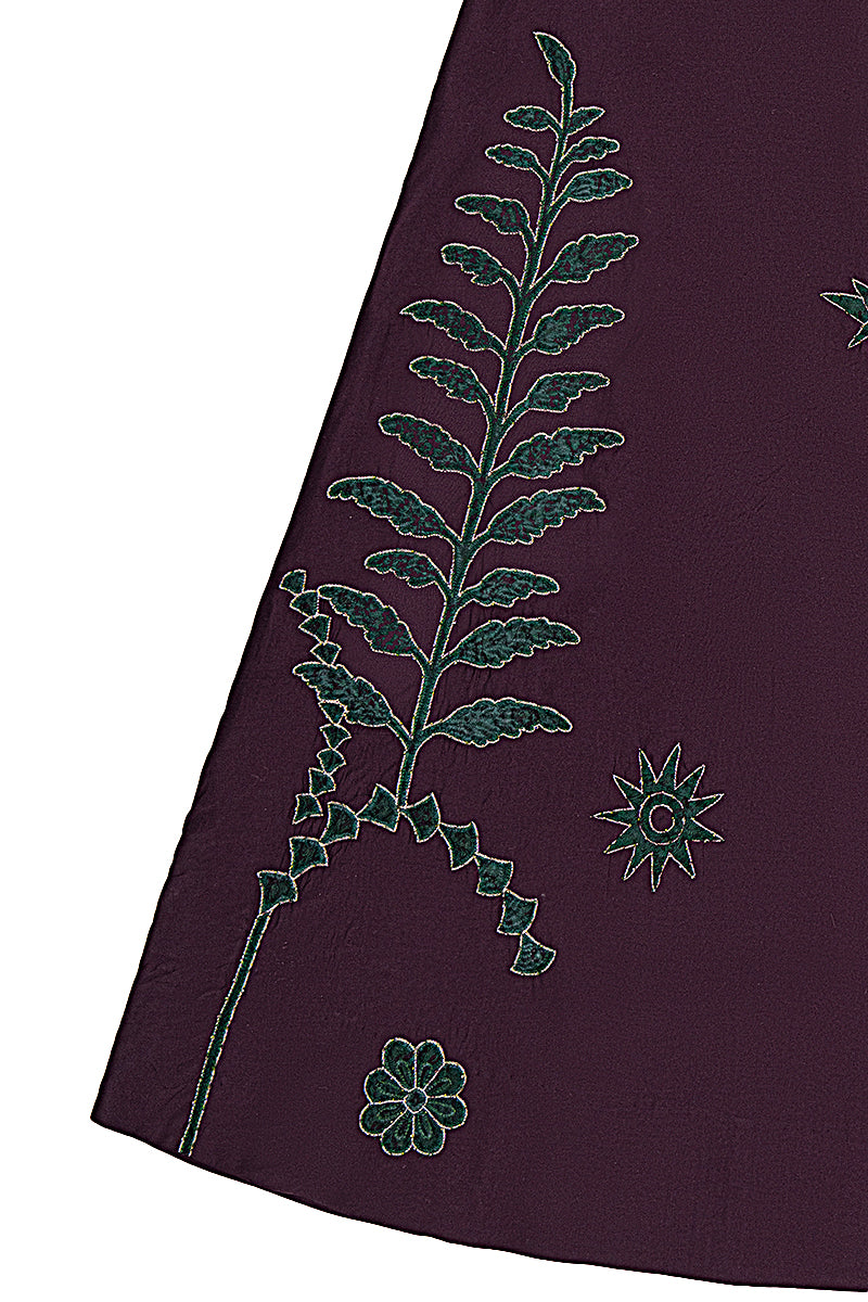 Long A-line cut dress (fabric) in dark purple with brocade cutout detailing in an emerald shade with resham, tilla and cut-dana hand embroidery. The back of the dress has a centered pleated detail
