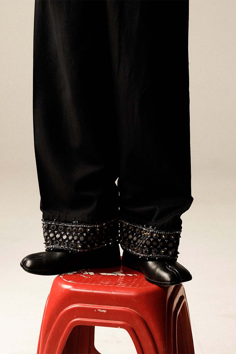 Detailed hand-embroidered trousers in a relaxed fit with tilla, resham, beading and metallic coin embellishments. An elevated variation of the Aomi shalwar-trouser.