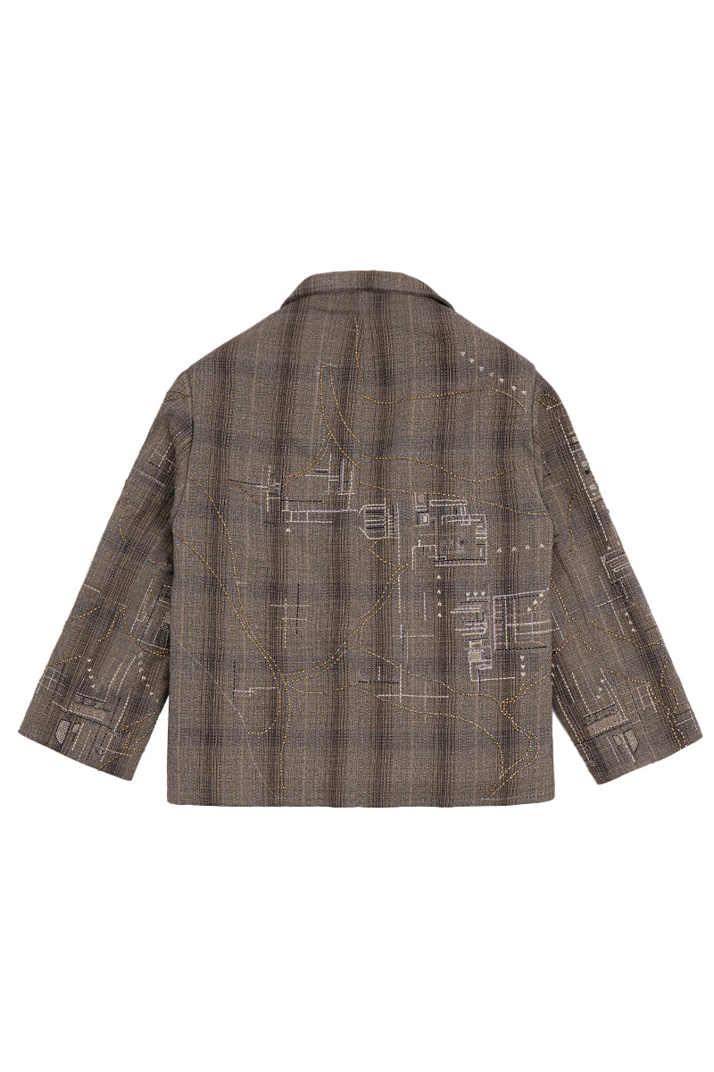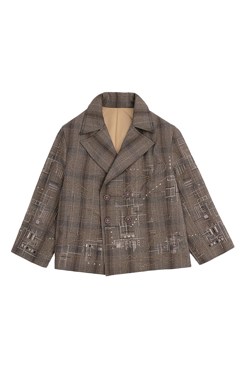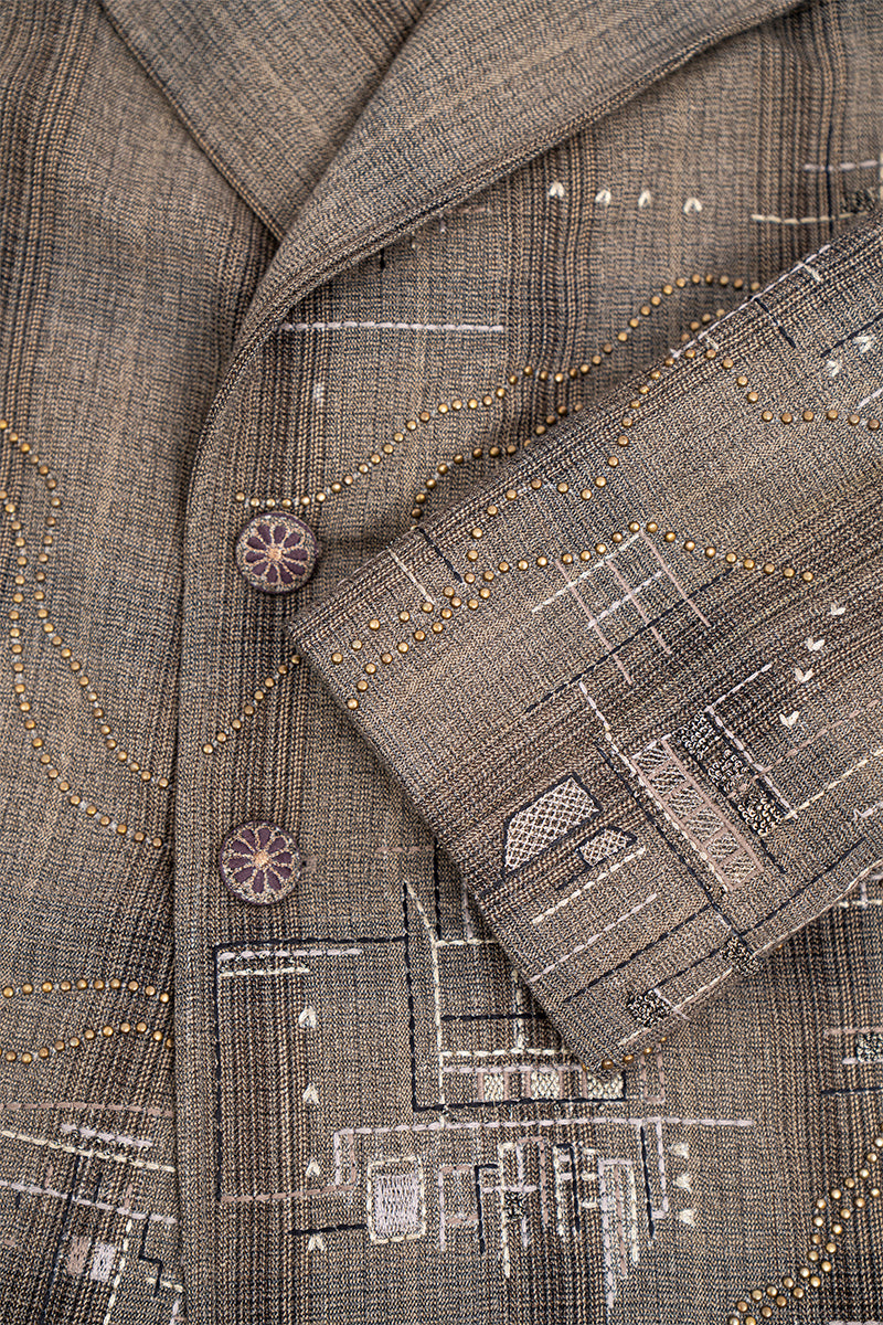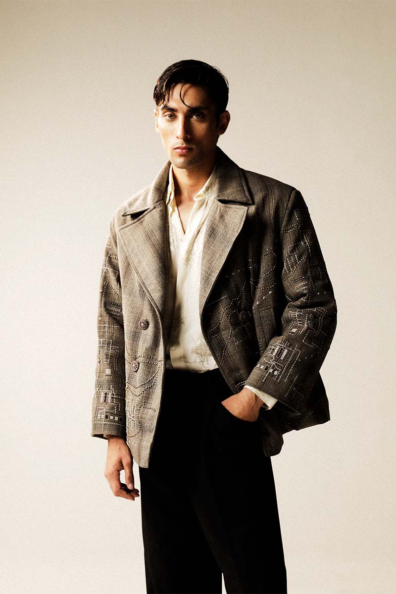 Textured woven, double-breasted, quilted pea-coat with hand-drawn and hand-embroidered French knots, resham embroidery and stud detailing depicting architectural references from the Indus Civilization. Further accentuated with floral embroidered buttons. The coat has a straight bottom and a wide collar