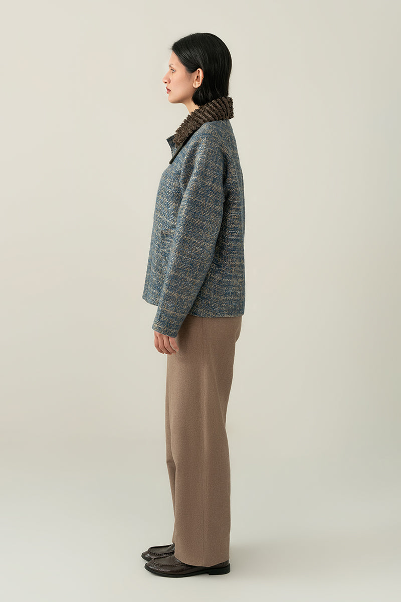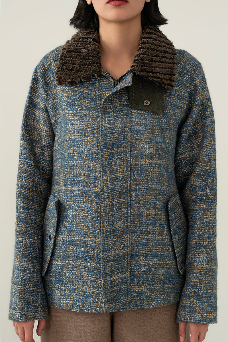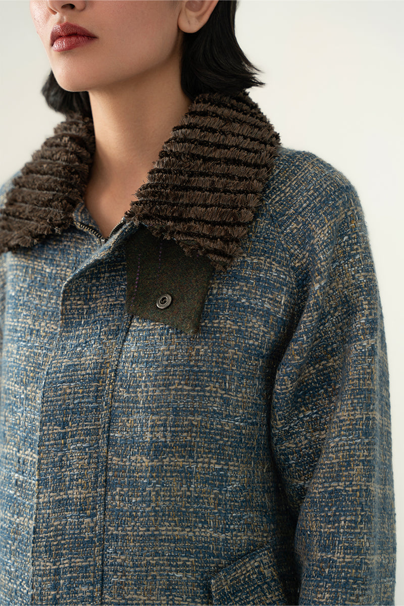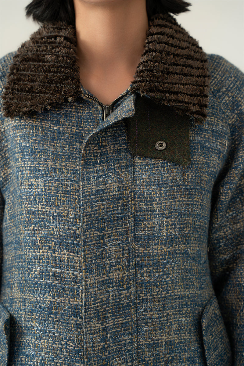 A steel blue tweed jacket inspired by classic utility wear. Featuring a fully handcrafted collar created using a specialised technique for a soft, fur-like texture. Finished with a collar latch, corduroy wales, and snap-button flap pockets.