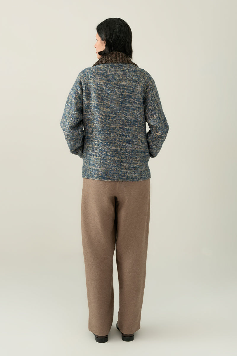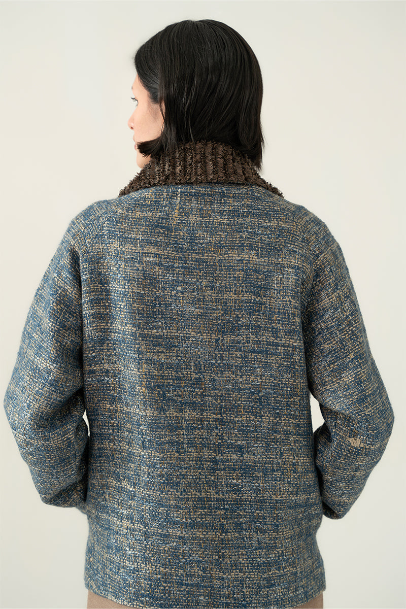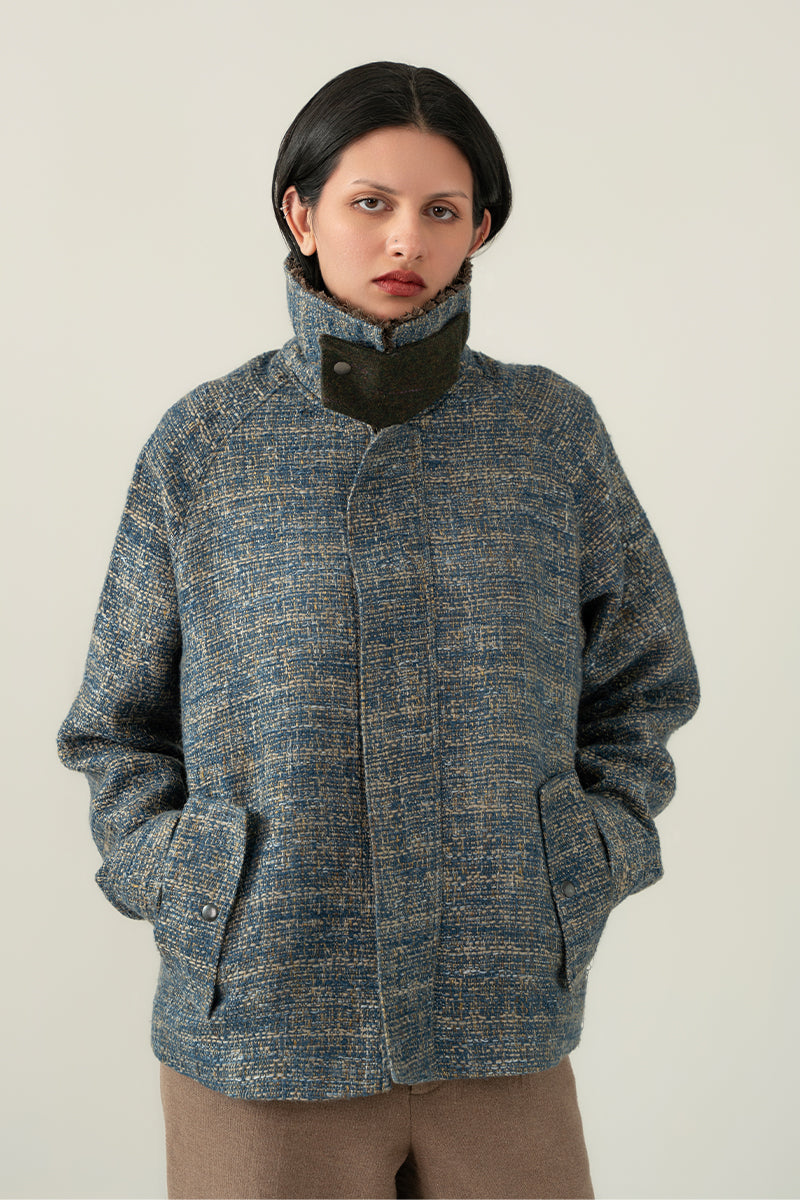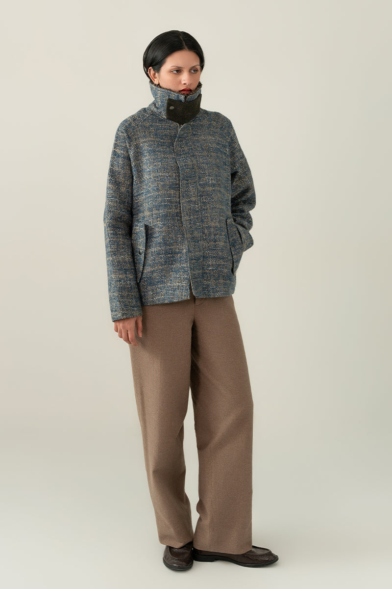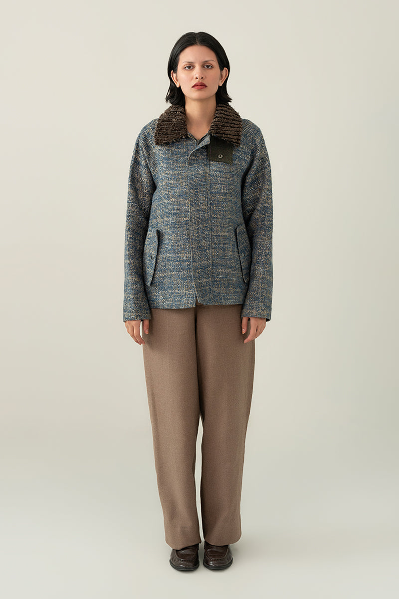 A steel blue tweed jacket inspired by classic utility wear. Featuring a fully handcrafted collar created using a specialised technique for a soft, fur-like texture. Finished with a collar latch, corduroy wales, and snap-button flap pockets.