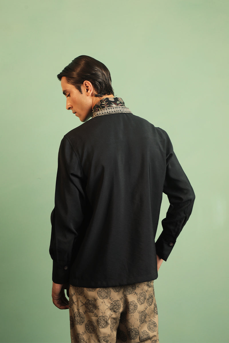 Black, tailored button-up shirt with an embroidered collar detailed with elements taken from Aomi's mystic jungle and embroidered buttons on the placket and cuffs. Hand-embellished with resham and tilla.