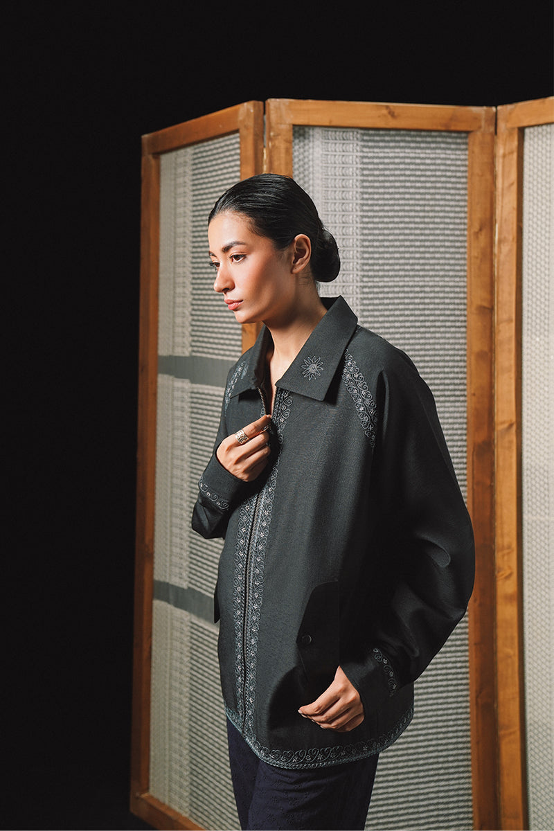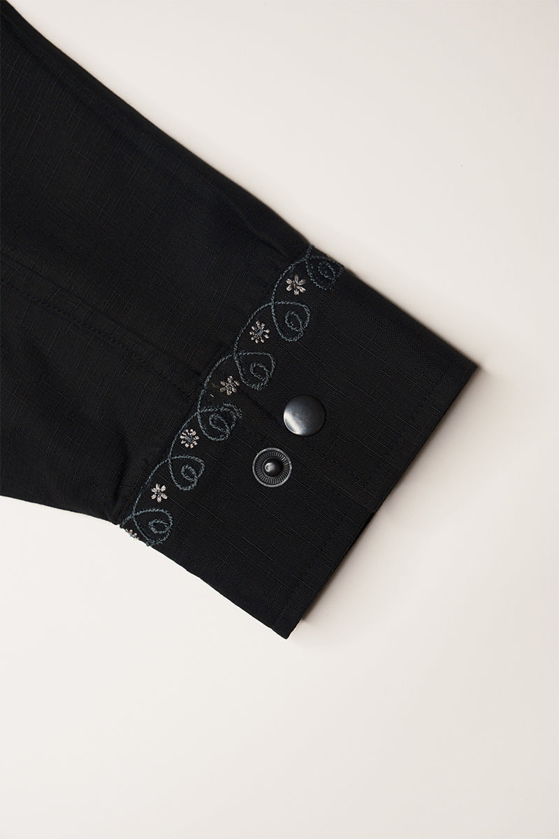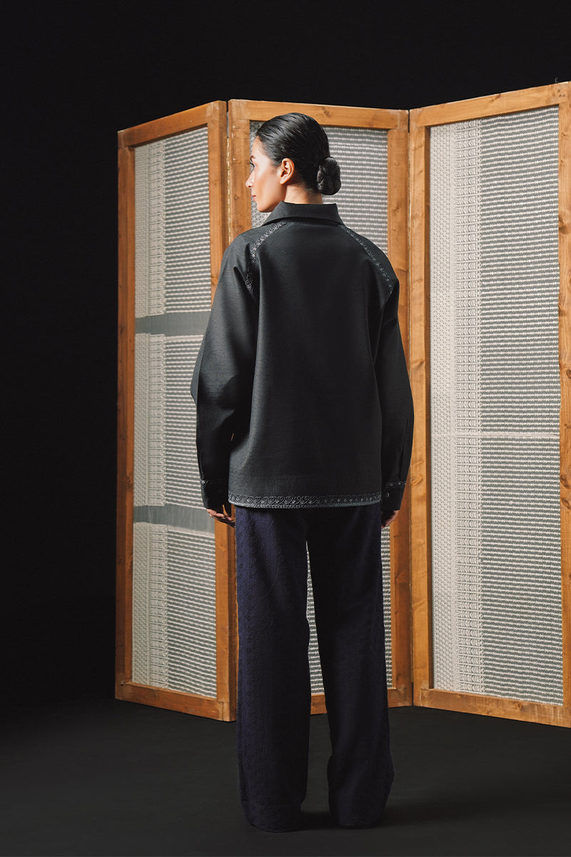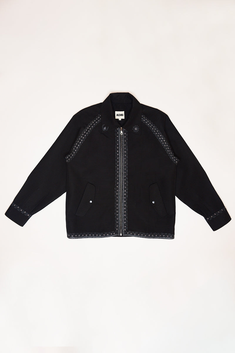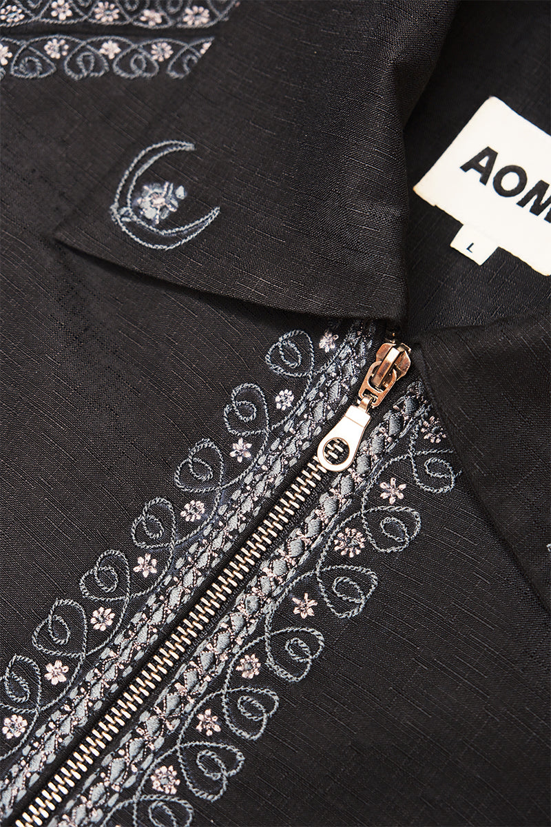 The Leo textured, zip-up summer jacket in tones of black and grey has the classic Aomi design elements featuring intricate border pattern-work adorned with Aomi's intricate hearts border, crafted in contrasting Dori work on the sleeves and front opening. The jacket has the Aomi sun and moon patterns embroidered on the collar. Leo can be worn both on its own or as a layer. The jacket is crafted in a cotton silk fabric for a wearable yet luxurious look.
