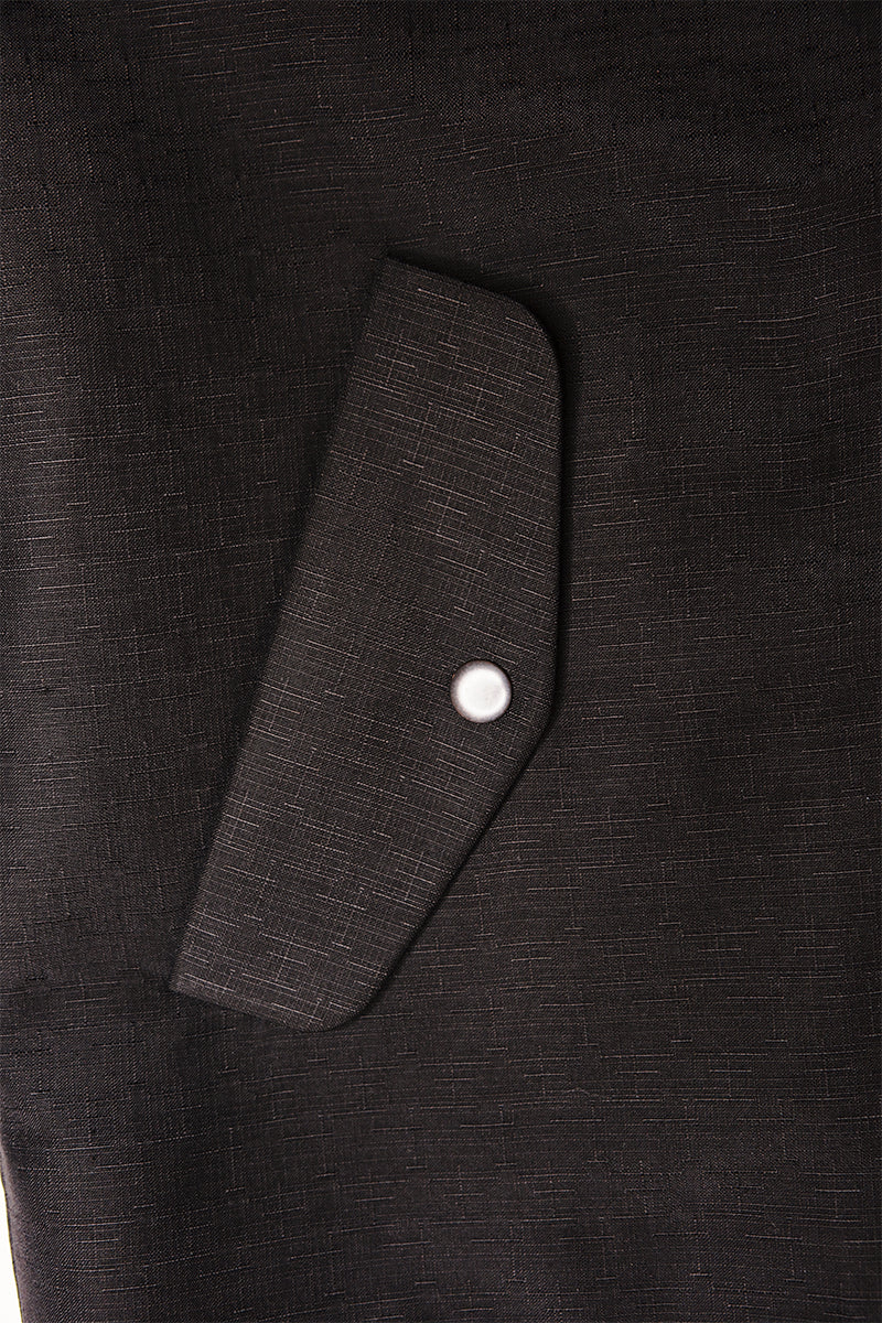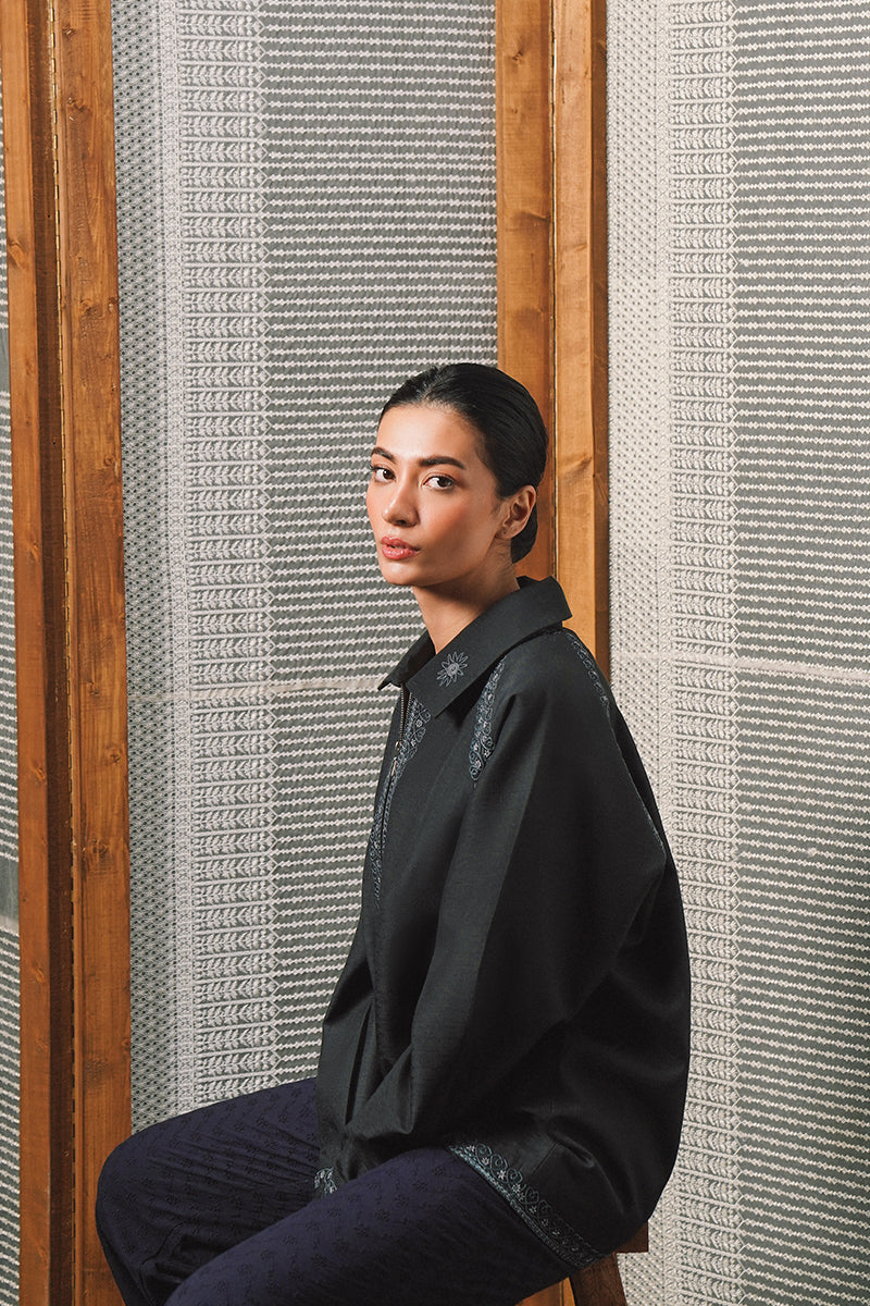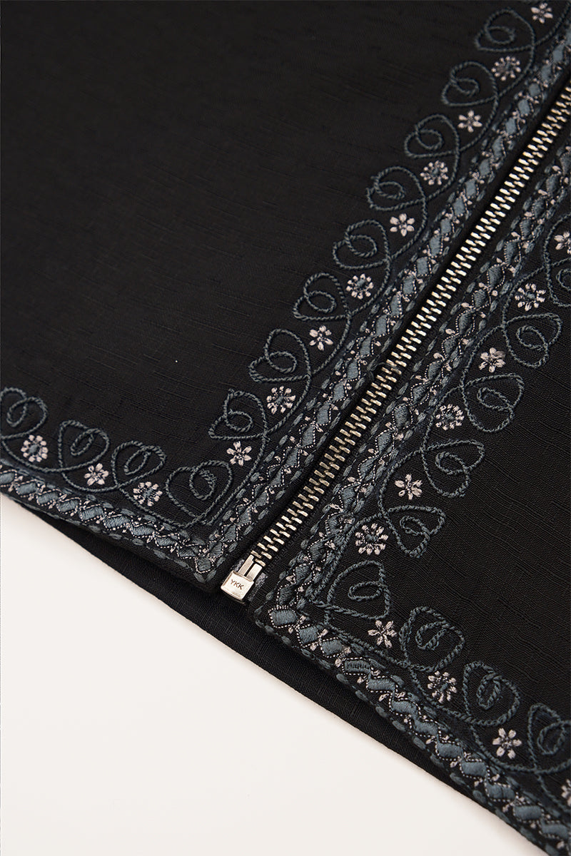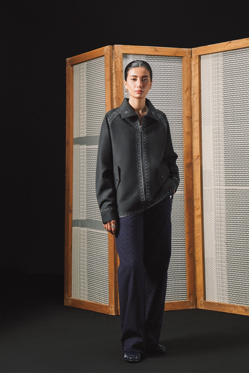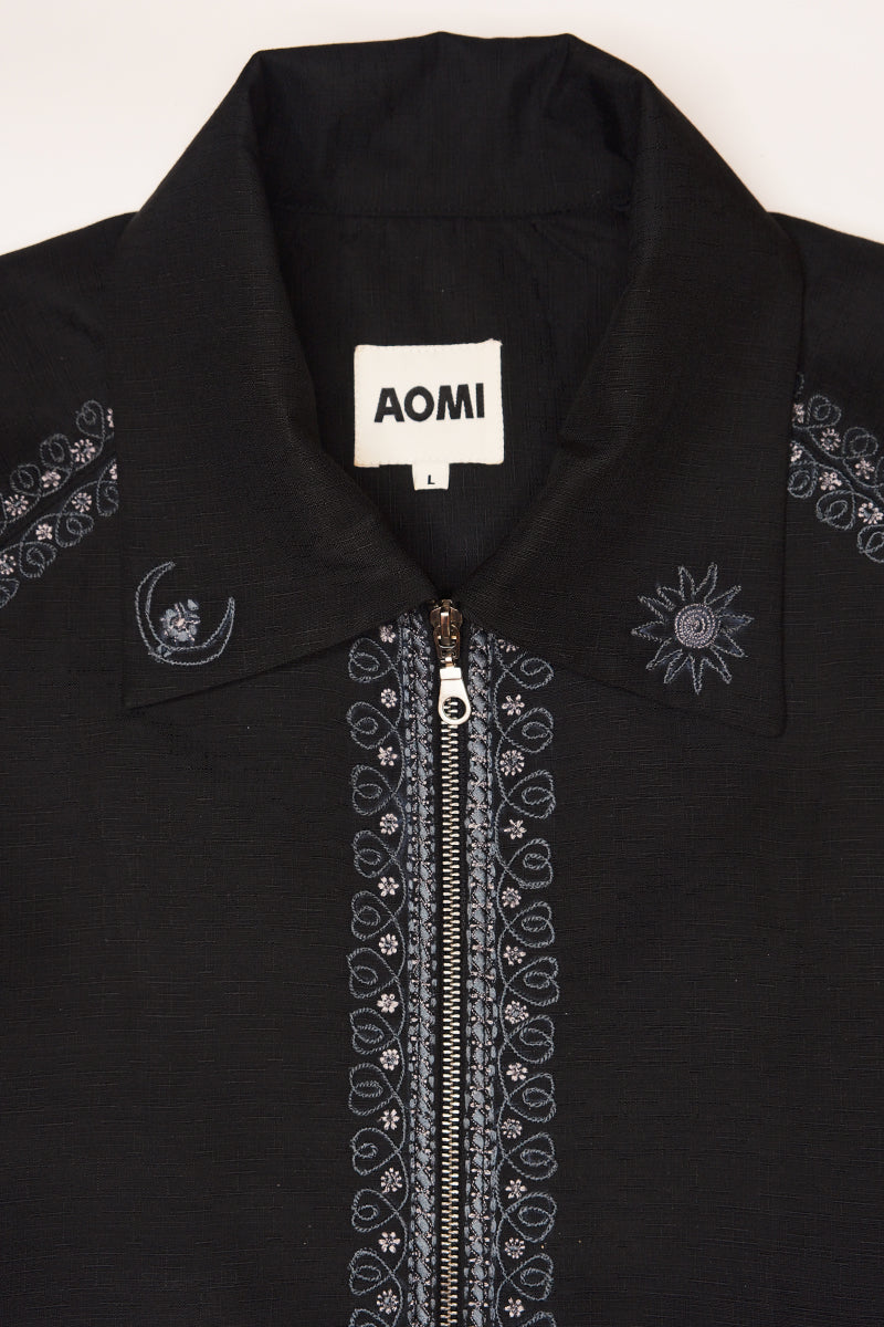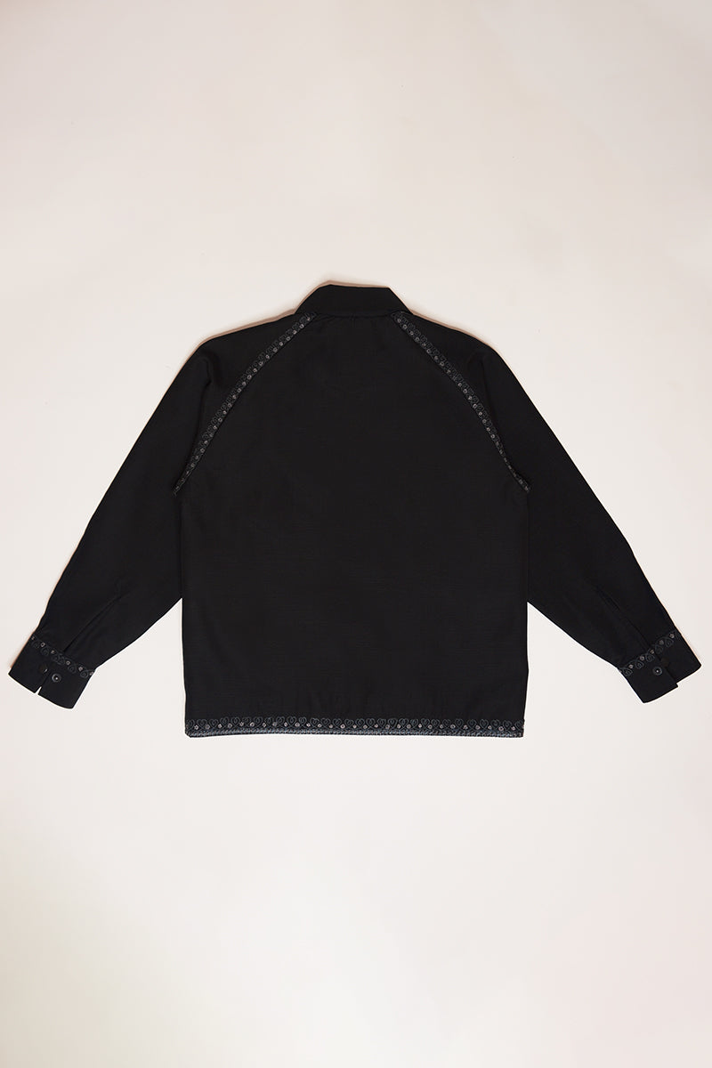The Leo textured, zip-up summer jacket in tones of black and grey has the classic Aomi design elements featuring intricate border pattern-work adorned with Aomi's intricate hearts border, crafted in contrasting Dori work on the sleeves and front opening. The jacket has the Aomi sun and moon patterns embroidered on the collar. Leo can be worn both on its own or as a layer. The jacket is crafted in a cotton silk fabric for a wearable yet luxurious look.