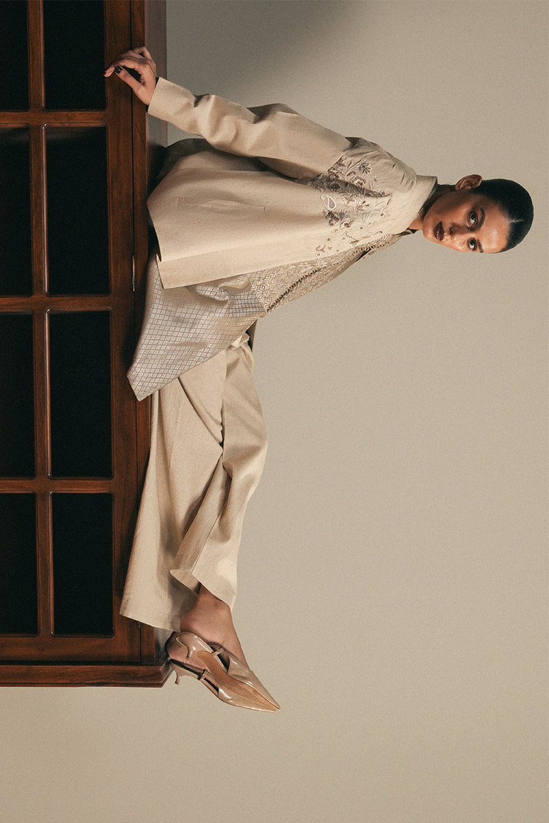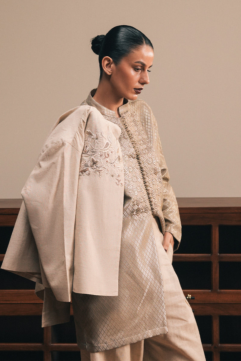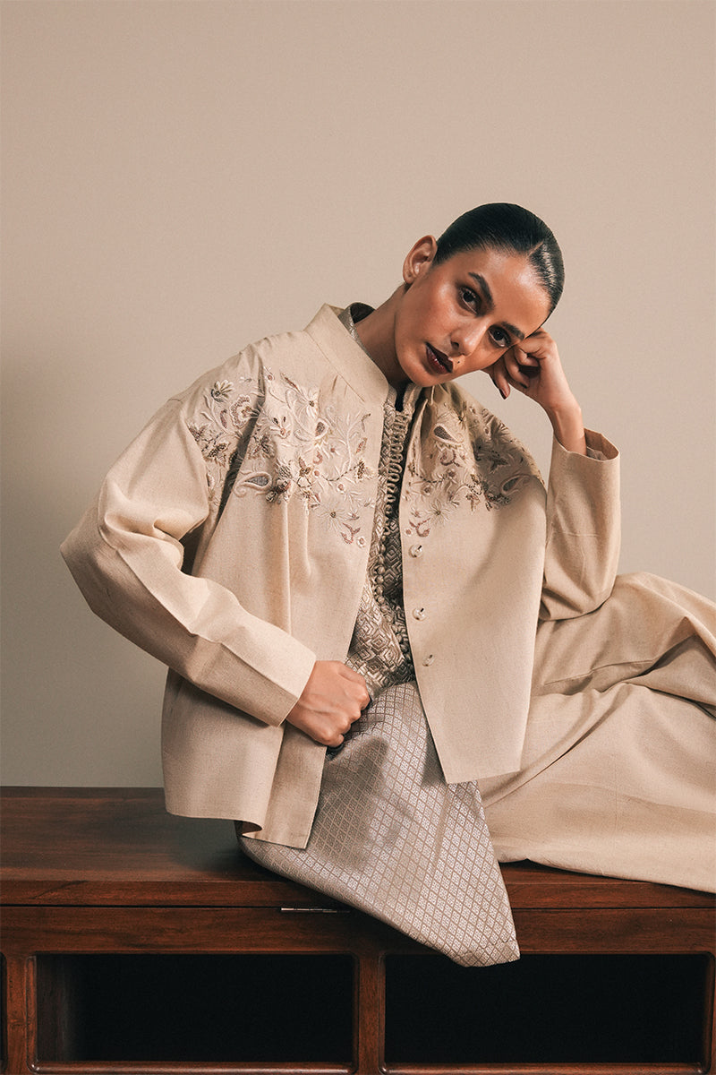The effortless, relaxed cut jacket featuring a mandarin collar, concealed placket and pleated shoulder detailing showcases handworked floral and paisley patternwork accentuated with further hand embellished detailing. The jacket lining features a vintage hand-block motif sourced from Skardu, Pakistan