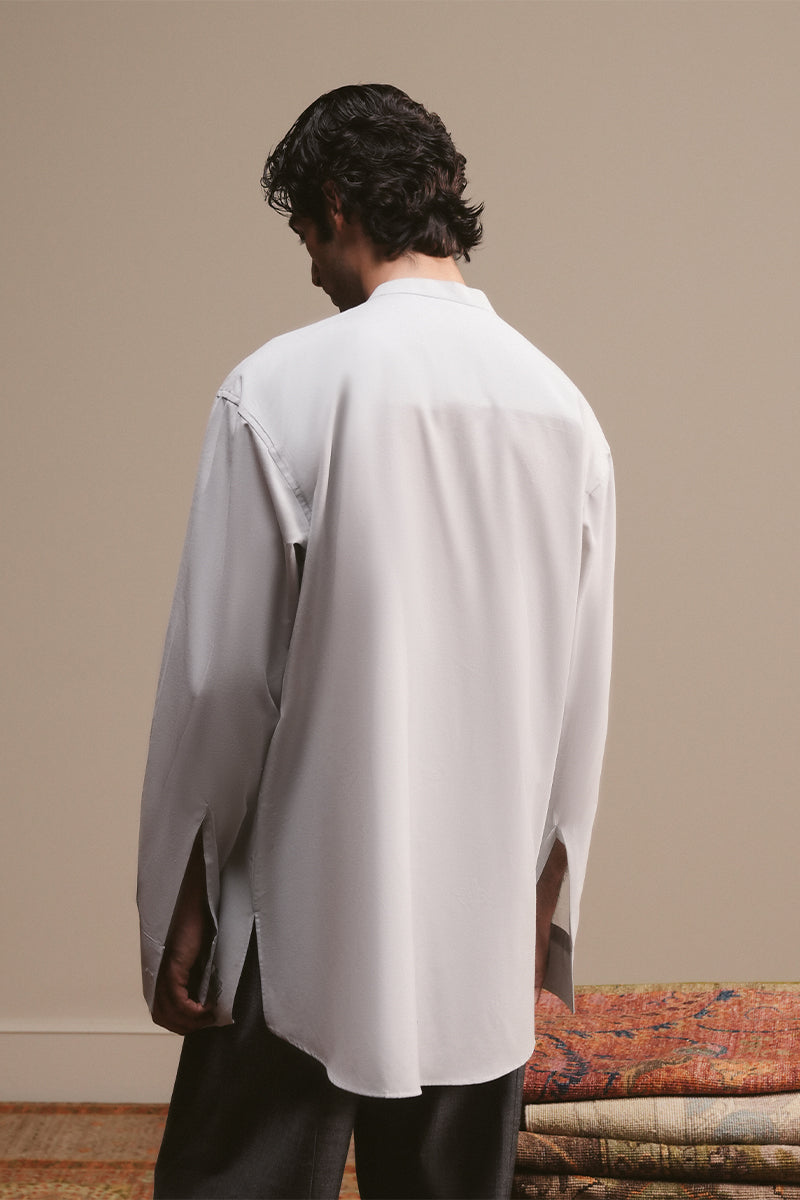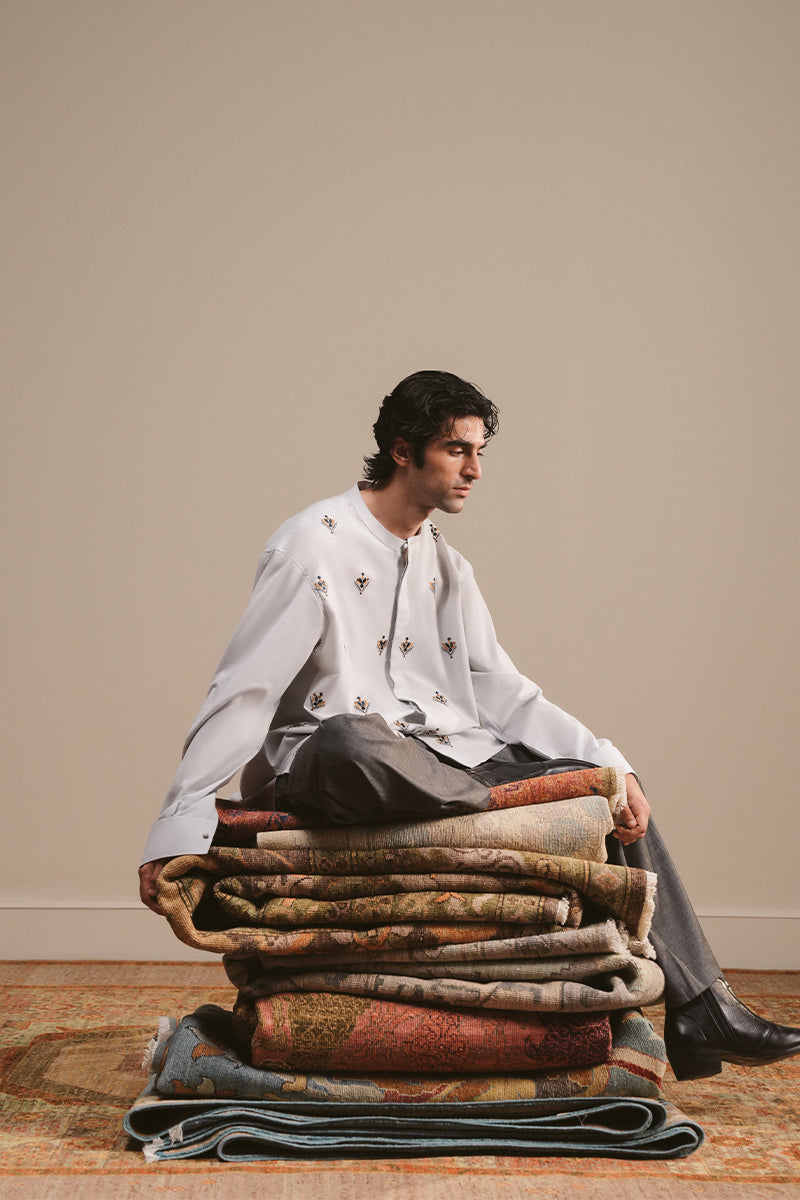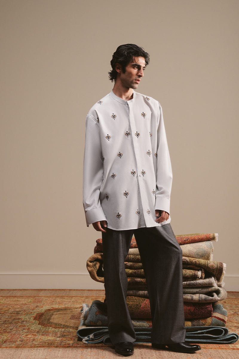 An effortless buttoned shirt cut from textured ice-blue Multan Karandi, elevated with handcrafted phulkari-inspired embroidery. A mandarin collar and concealed placket create a clean, modern line, while the repeated handcrafted patternwork lends depth to the piece.