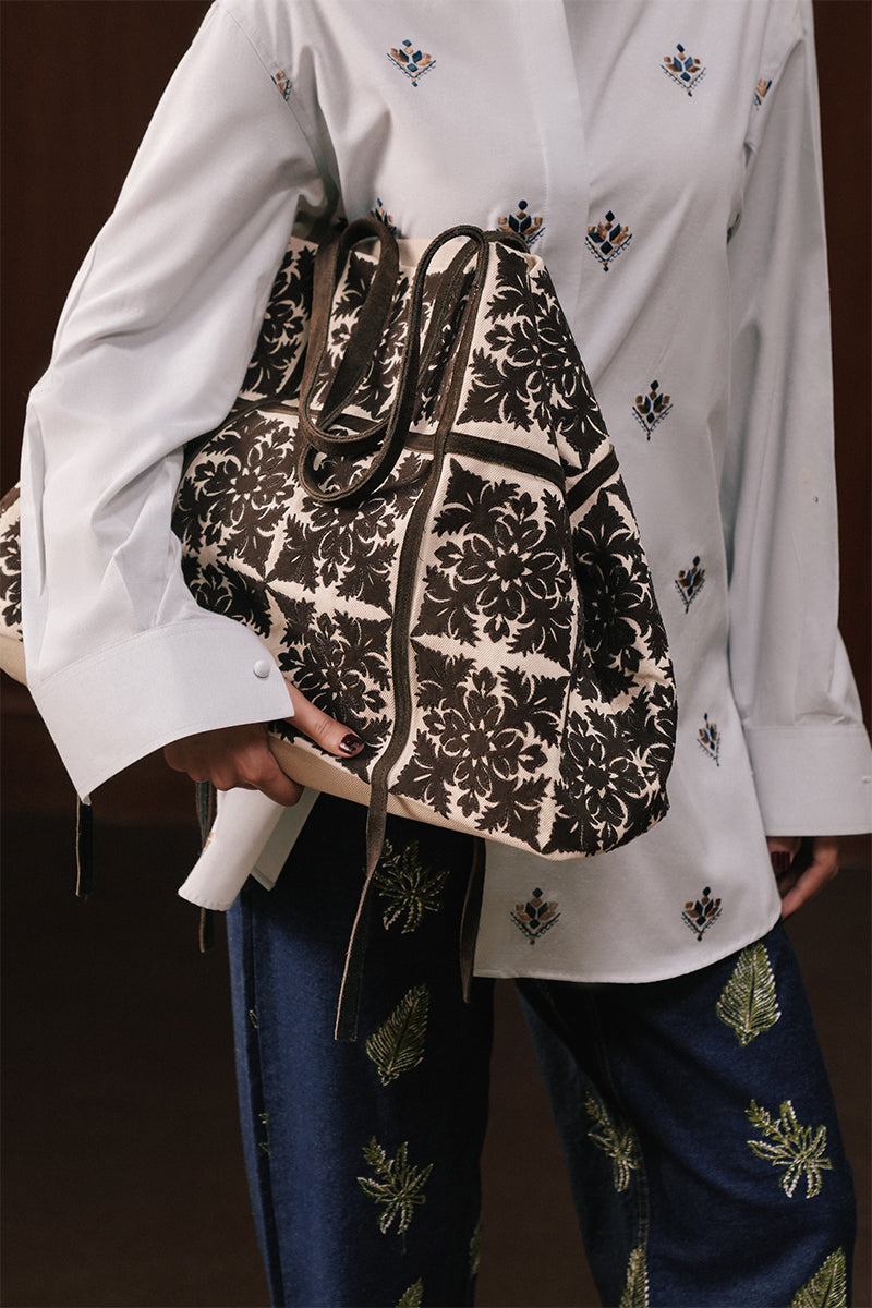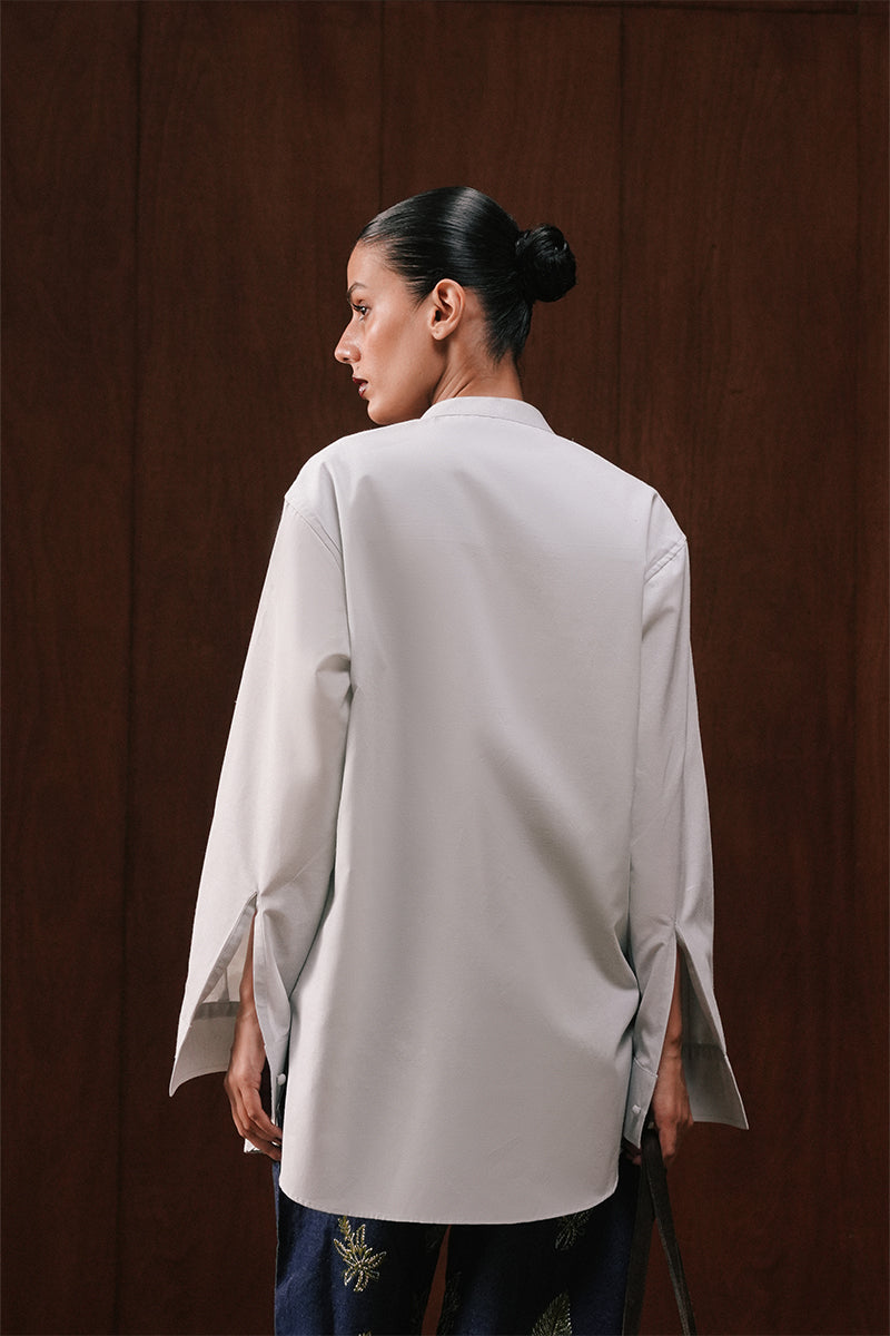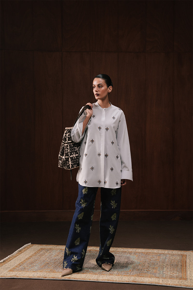 An effortless buttoned shirt cut from textured ice-blue Multan Karandi, elevated with handcrafted phulkari-inspired embroidery. A mandarin collar and concealed placket create a clean, modern line, while the repeated handcrafted patternwork lends depth to the piece.