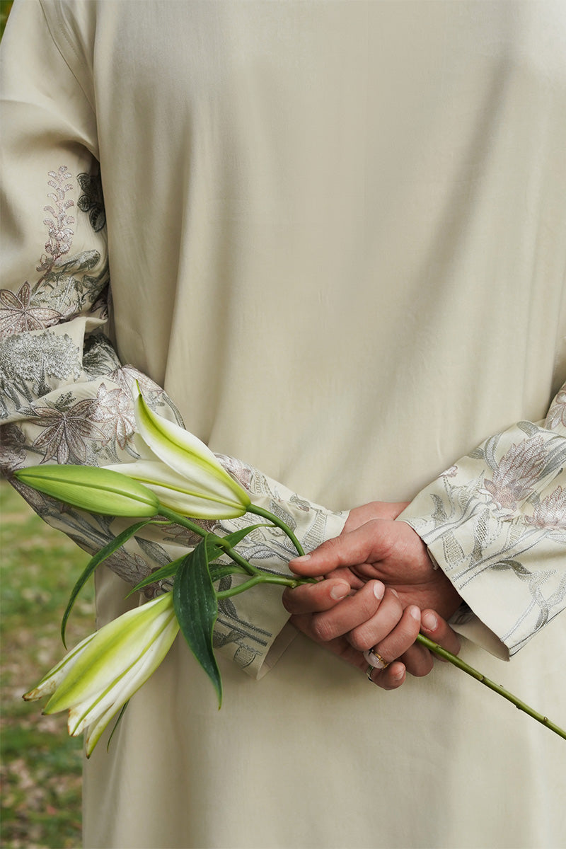 A luxurious cotton silk shirt-trouser set in a light cream tone detailed with fine embroidery of an all-over pattern depicting Aomi's mystic jungle.