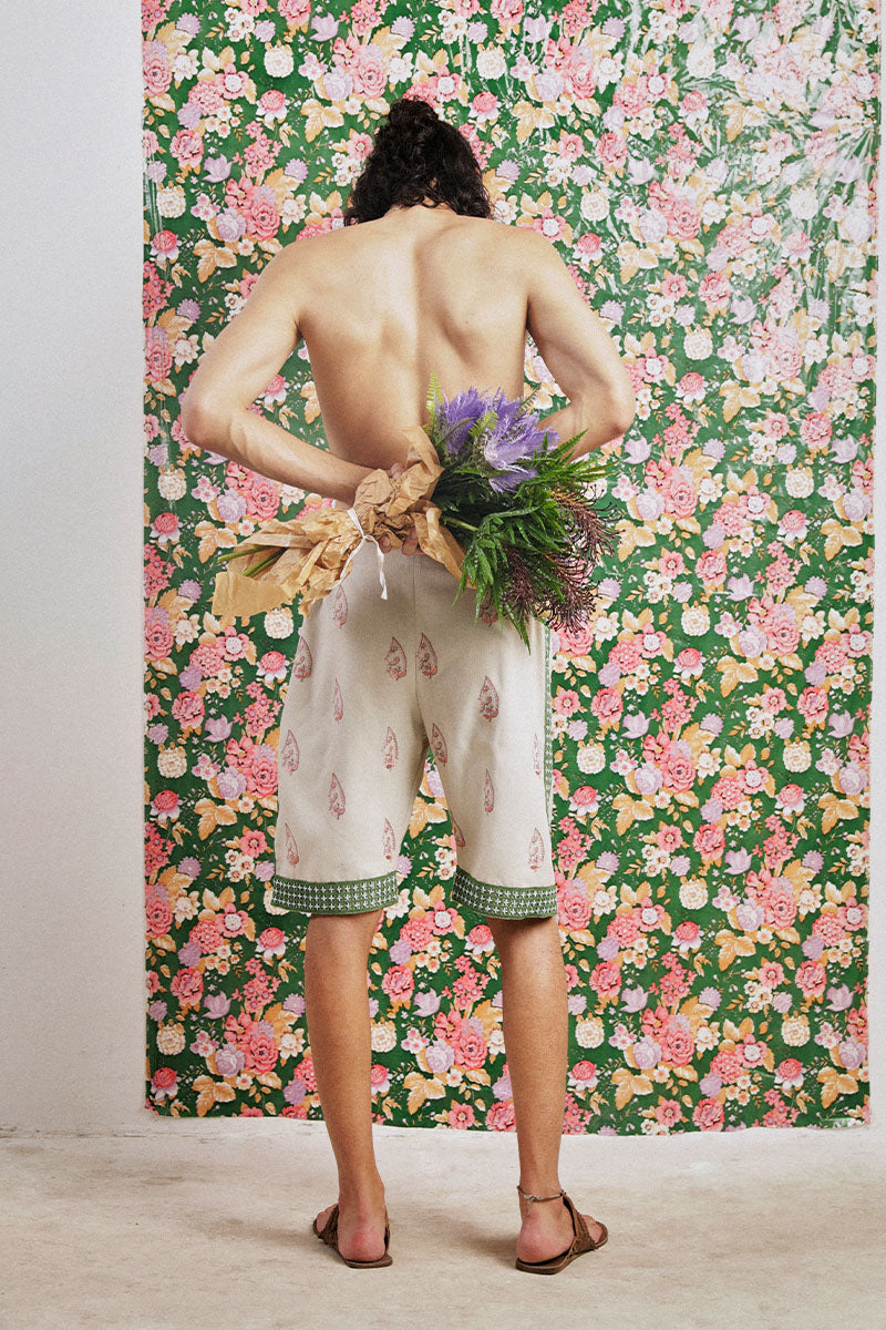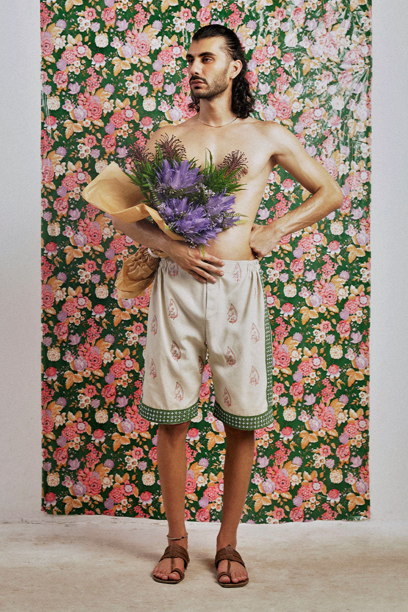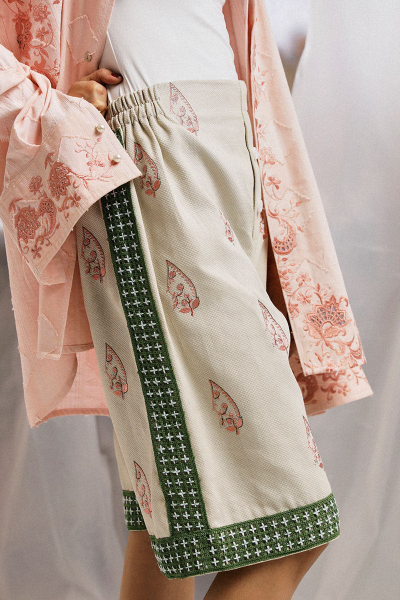 'Relaxed fit, tailored shorts in a textured woven fabric, with paisley embroidered motifs in tea-pink and earth-green tones. Detailed with lace panels with hand embroidered miniature detailing.