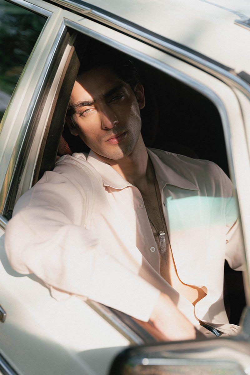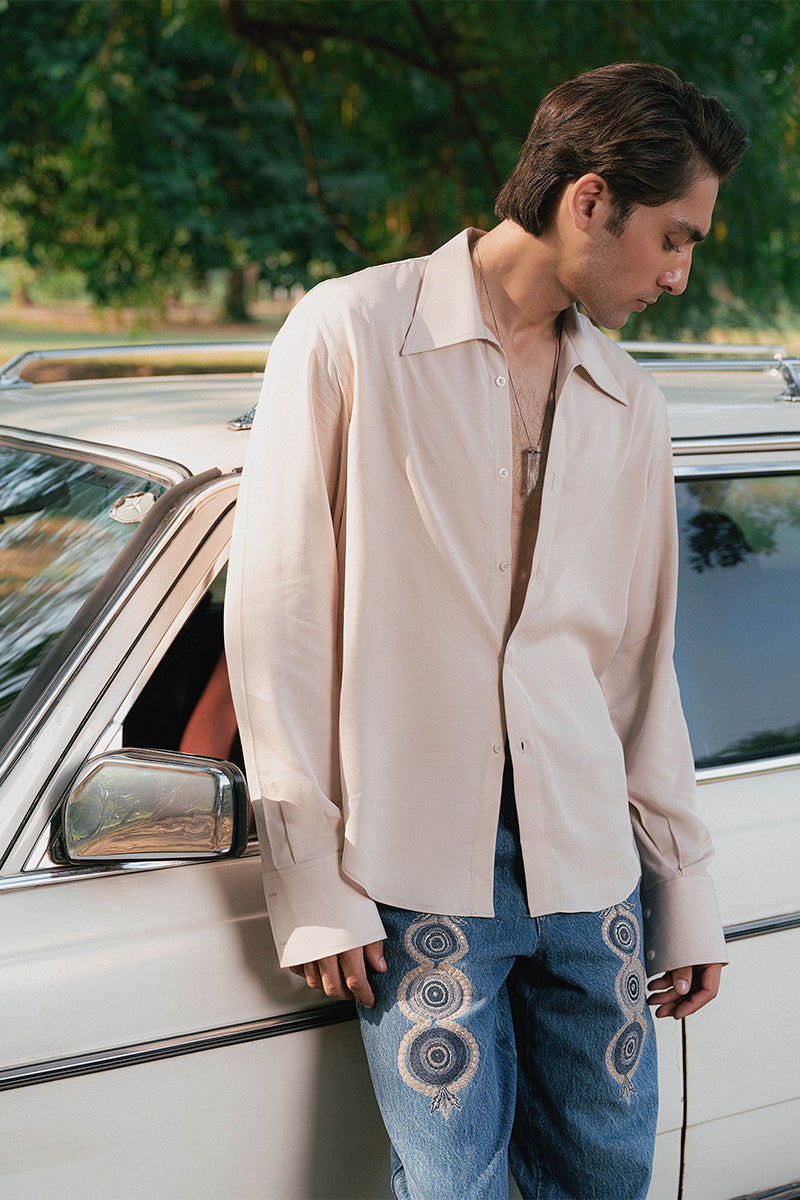 A classic Aomi shirt in a sand tone, featuring a larger collar and a relaxed fit.