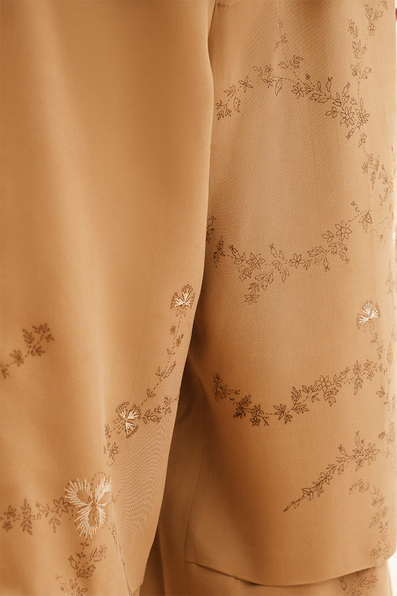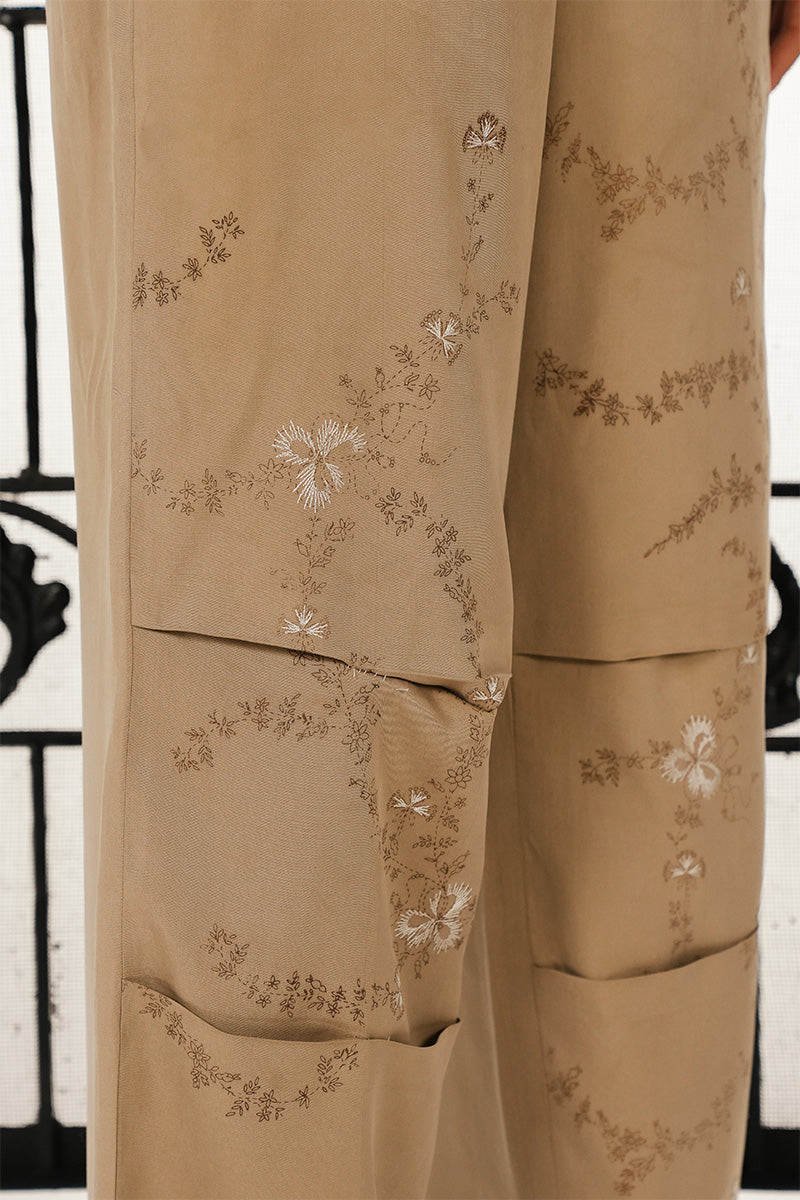 Monochromatic, tan, screen-printed & embroidered tailored trousers with pleated detailing on the front.