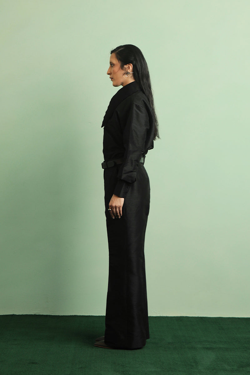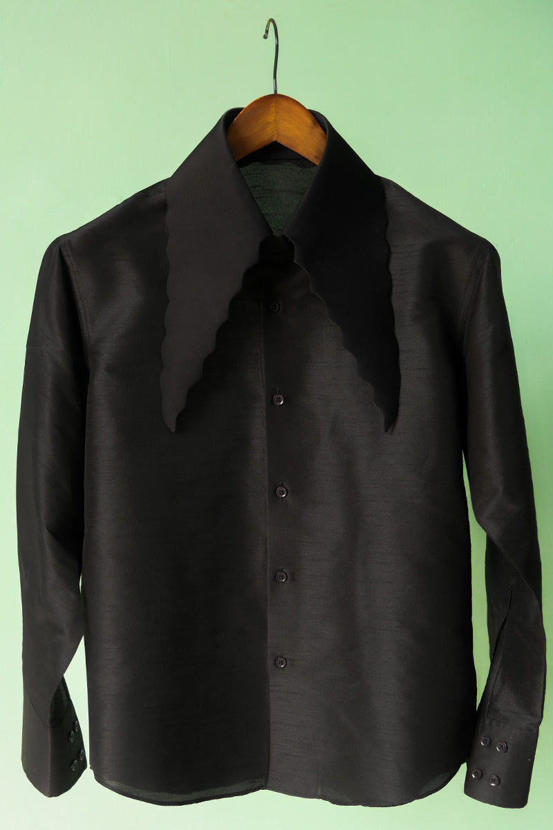 Black fine raw silk luxury tailored button-up with an exaggerated collar. Hand made construction.