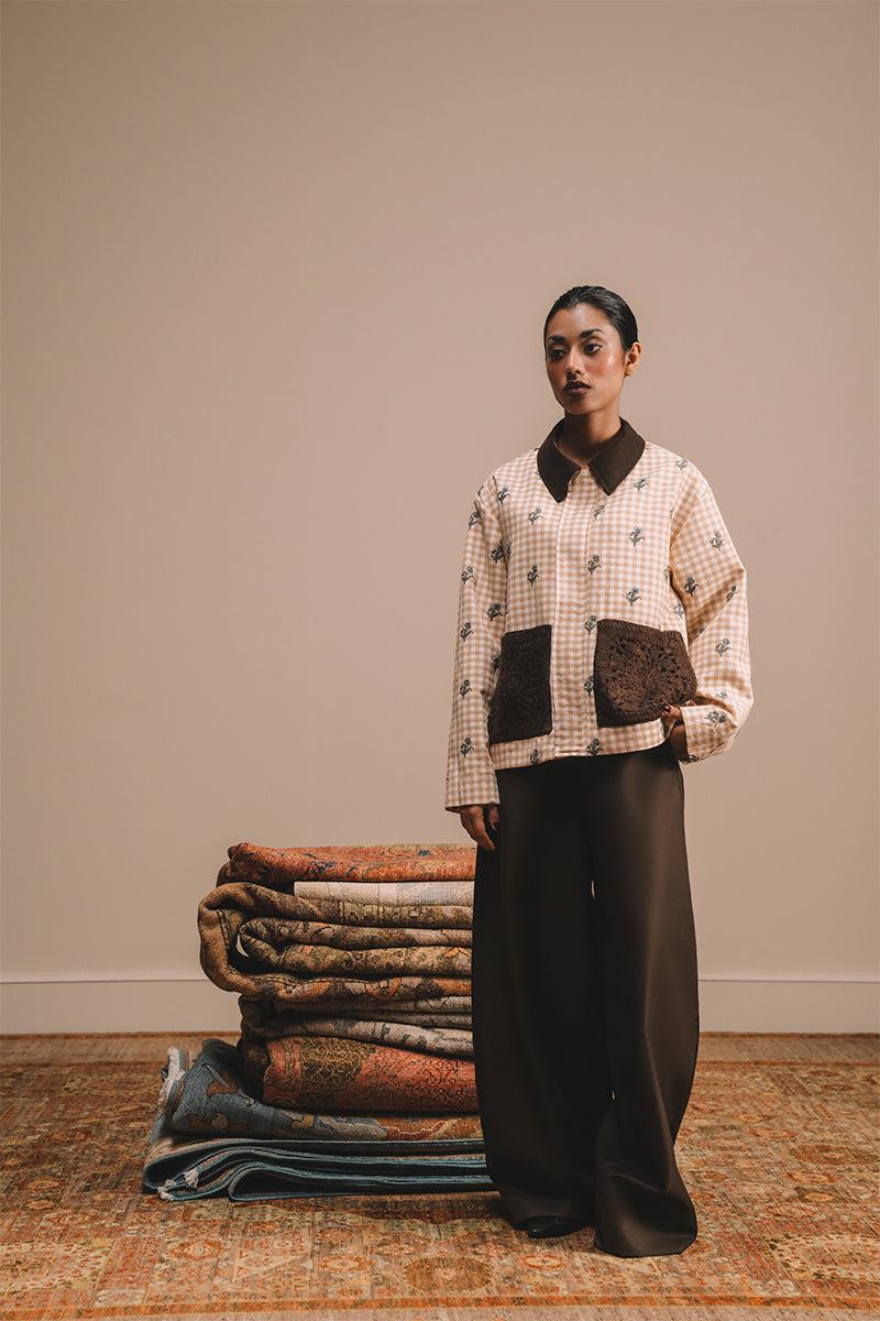 This checkered jacket, rendered in soft beige and white hues, is elevated by a dark chocolate collar that anchors the silhouette in bold contrast. All-over floral embroidery in earthy greens and blues lends depth, subtly illuminated with hand embroidered beadwork for a refined shimmer. The jacket is detailed with hand-made crochet-trimmed pockets. A considered balance of classic pattern and intricate handwork, the jacket embodies craft as a quiet statement.