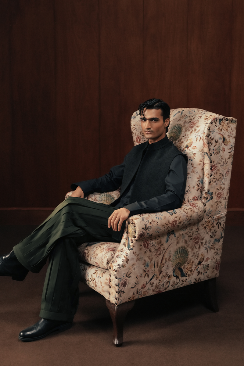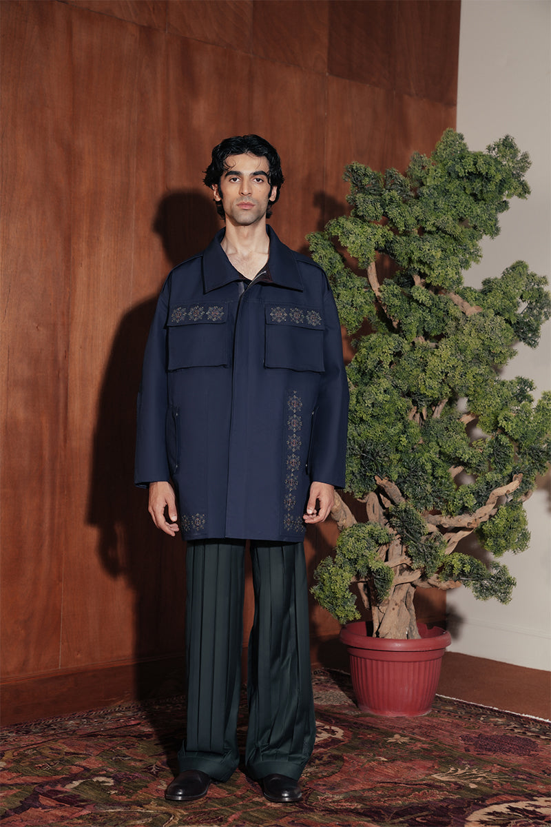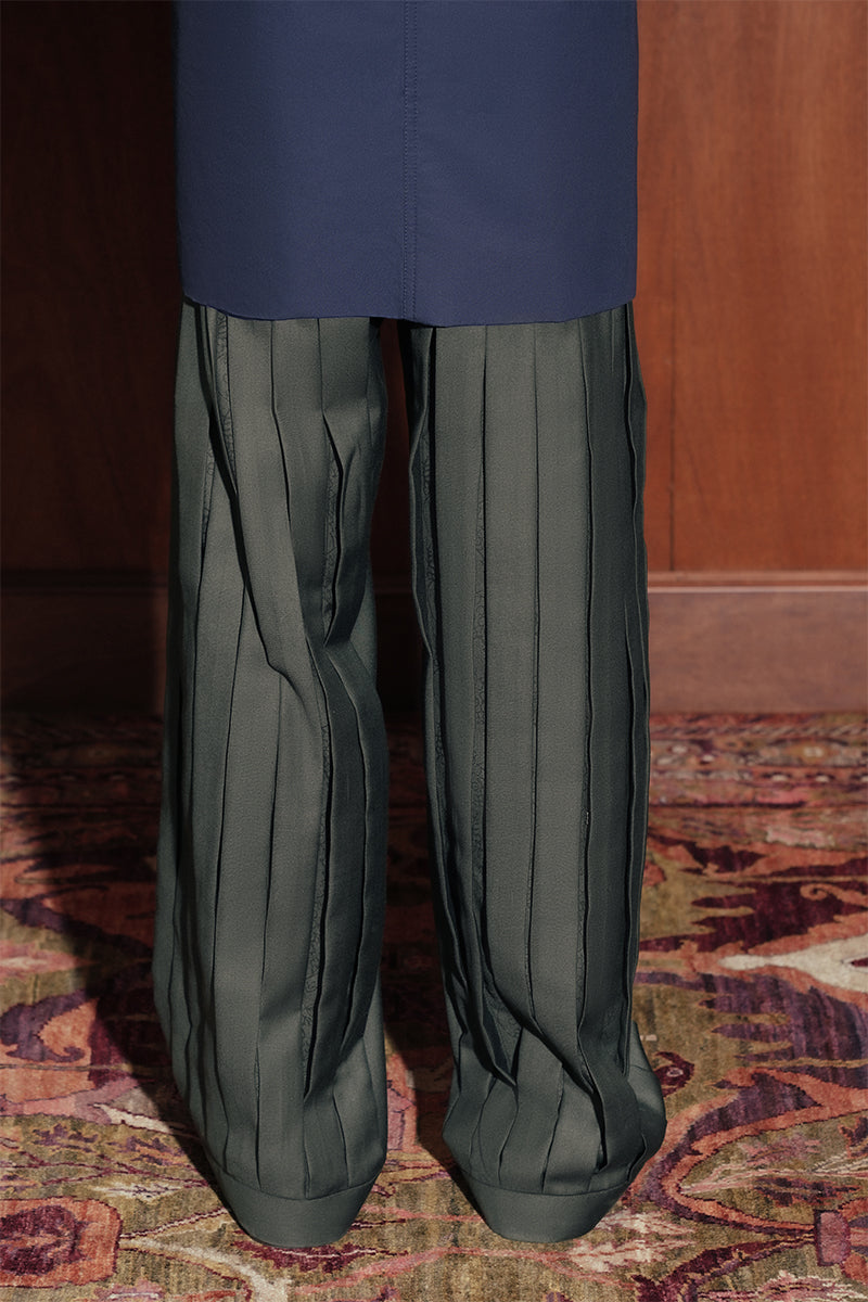A study in craft and tailoring, these trousers feature hand-formed vertical pleats, each concealing subtle vintage block-printed motifs sourced from Skardu,Pakistan. Precision and heritage intertwined in a modern silhouette.