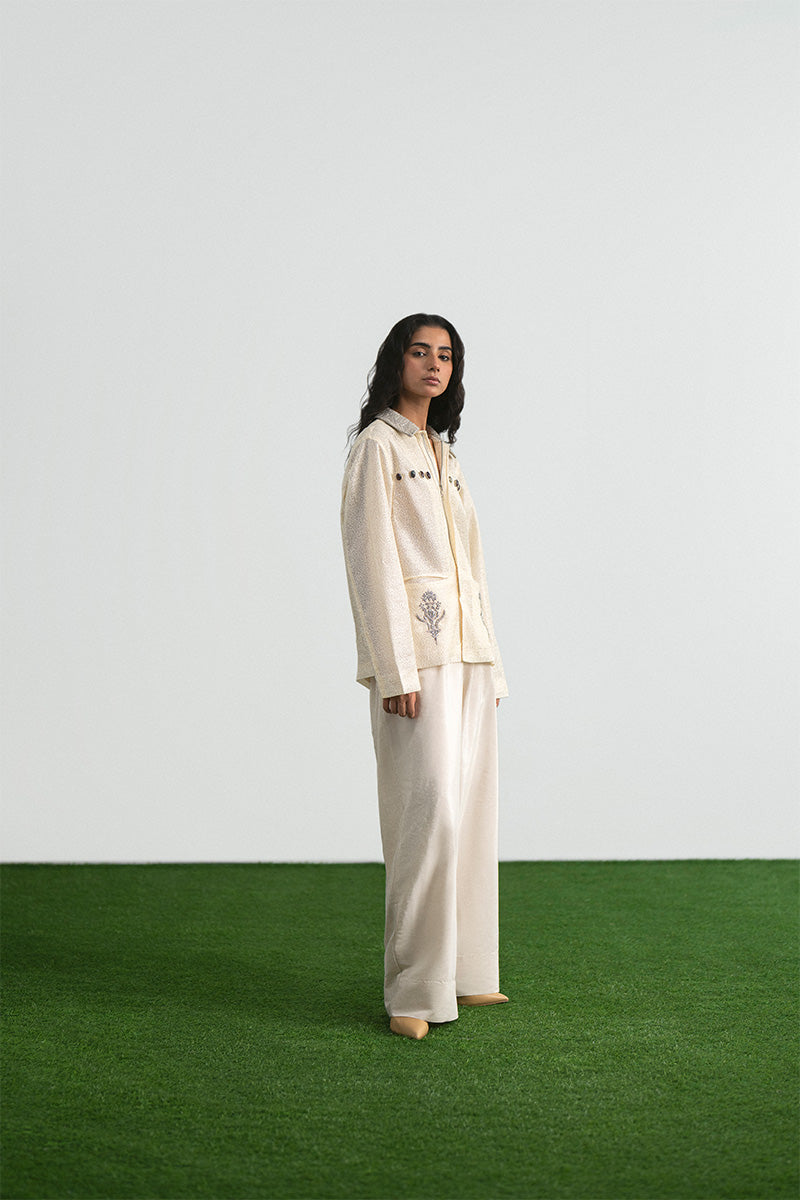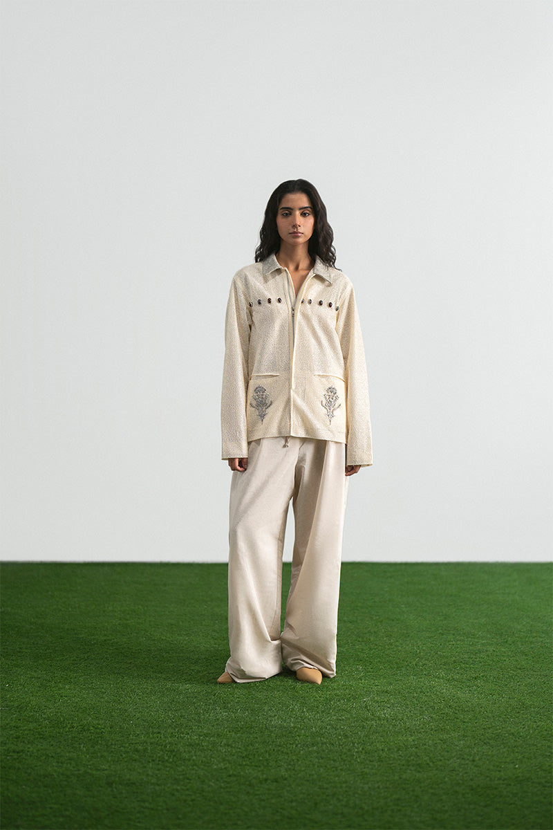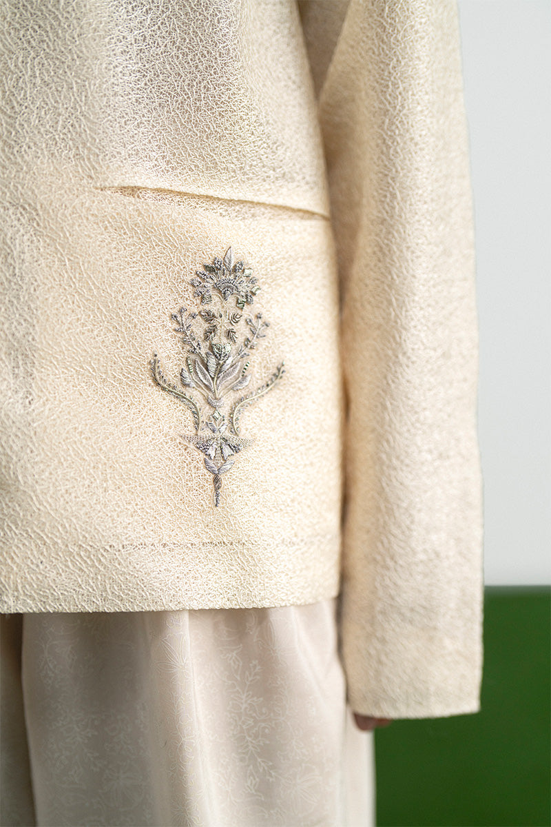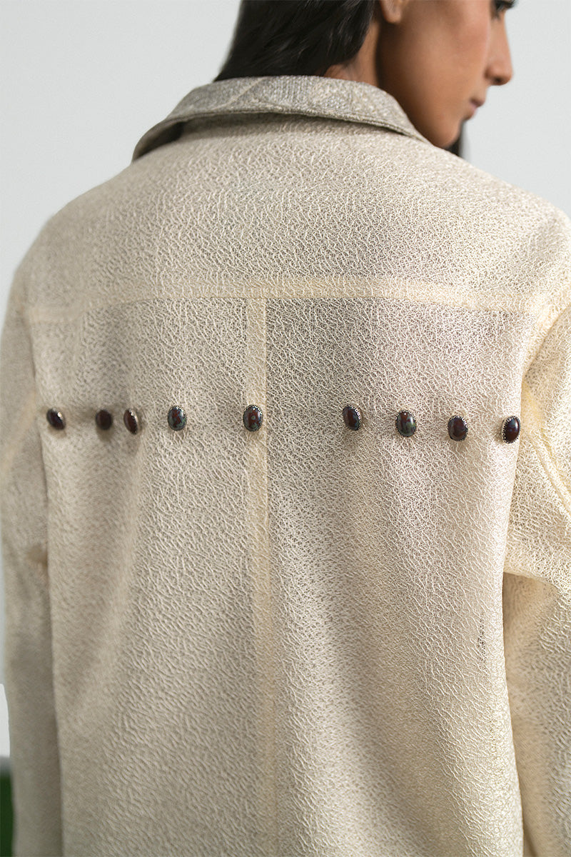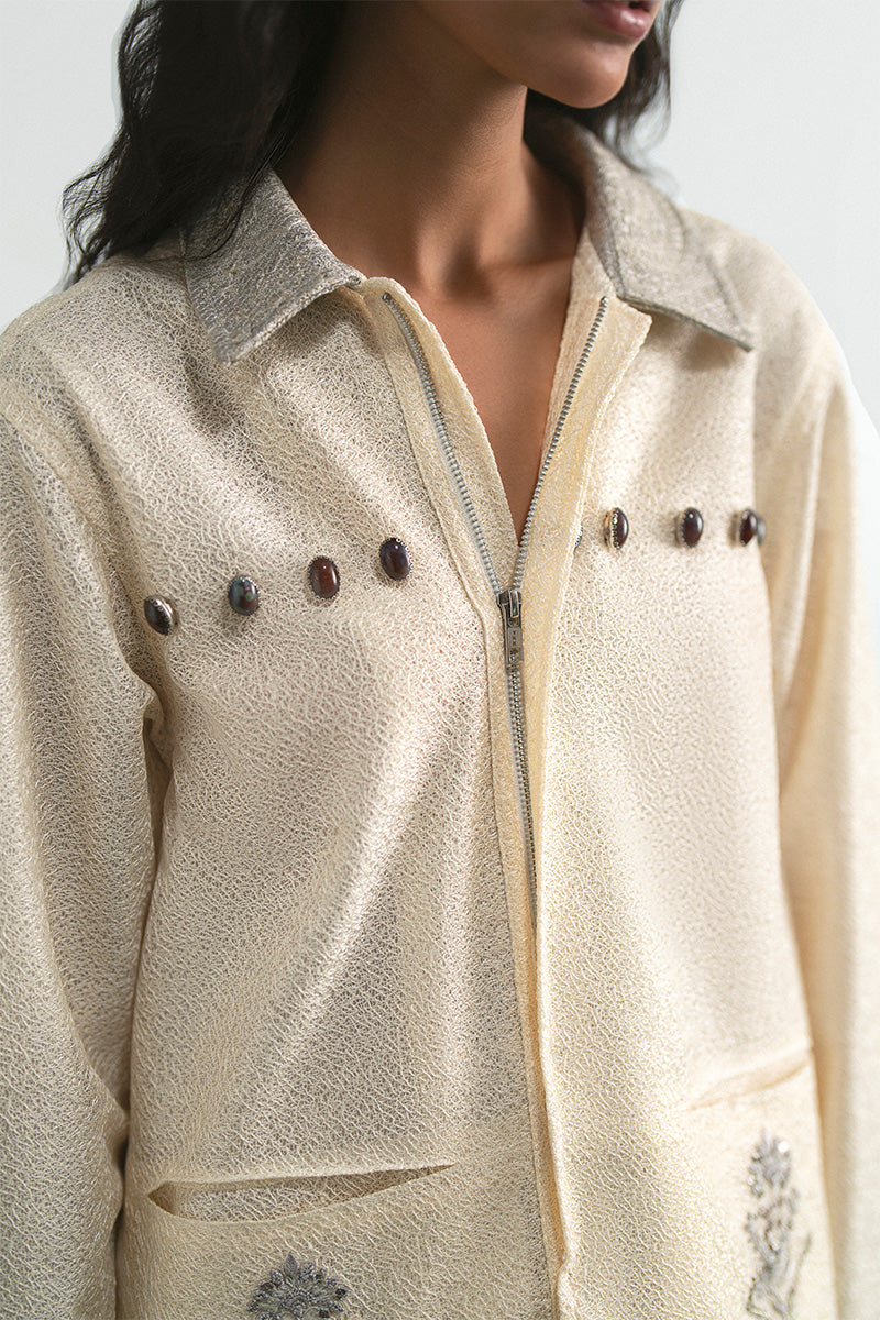 The edgy Kayal jacket in a lightweight webbed net with hand drawn and hand embroidered craftsmanship on the front pockets and hand embellished faux gemstone detailing on the front and back. The jacket is further detailed with a subtly embroidered collar and a front zipper.