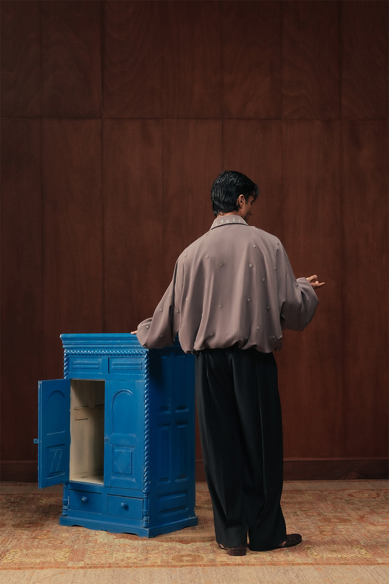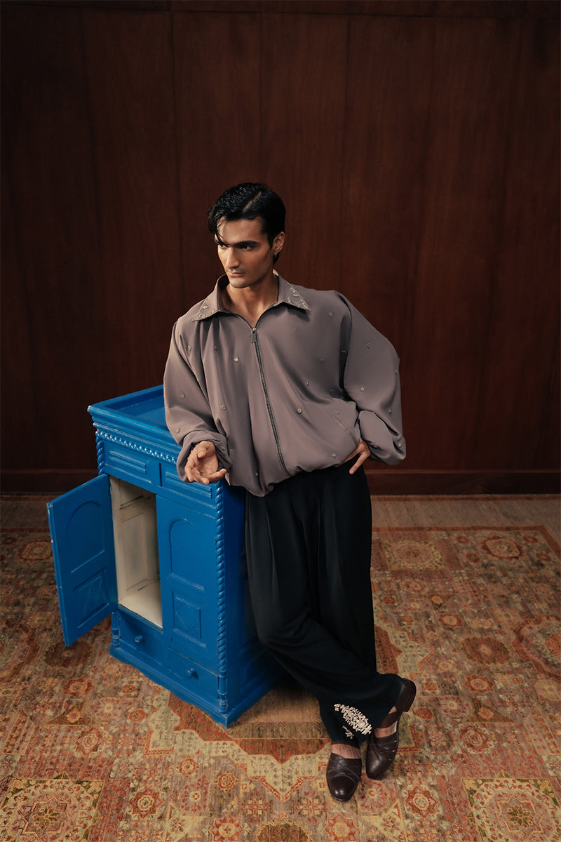 A tapered shalwar-trouser defined by soft waist pleats and box pleating at the hem. Hand-drawn and hand-embroidered motifs in contrasting cream trace the lower panels, blending ease of form with artisanal detail.