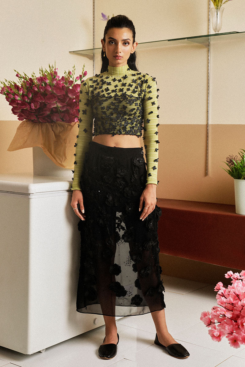 'Black sheer skirt with bicycle shorts, featuring hand crafted flowers individually hand- appliqued to create a 3D effect and further detailed with handworked embellishements.