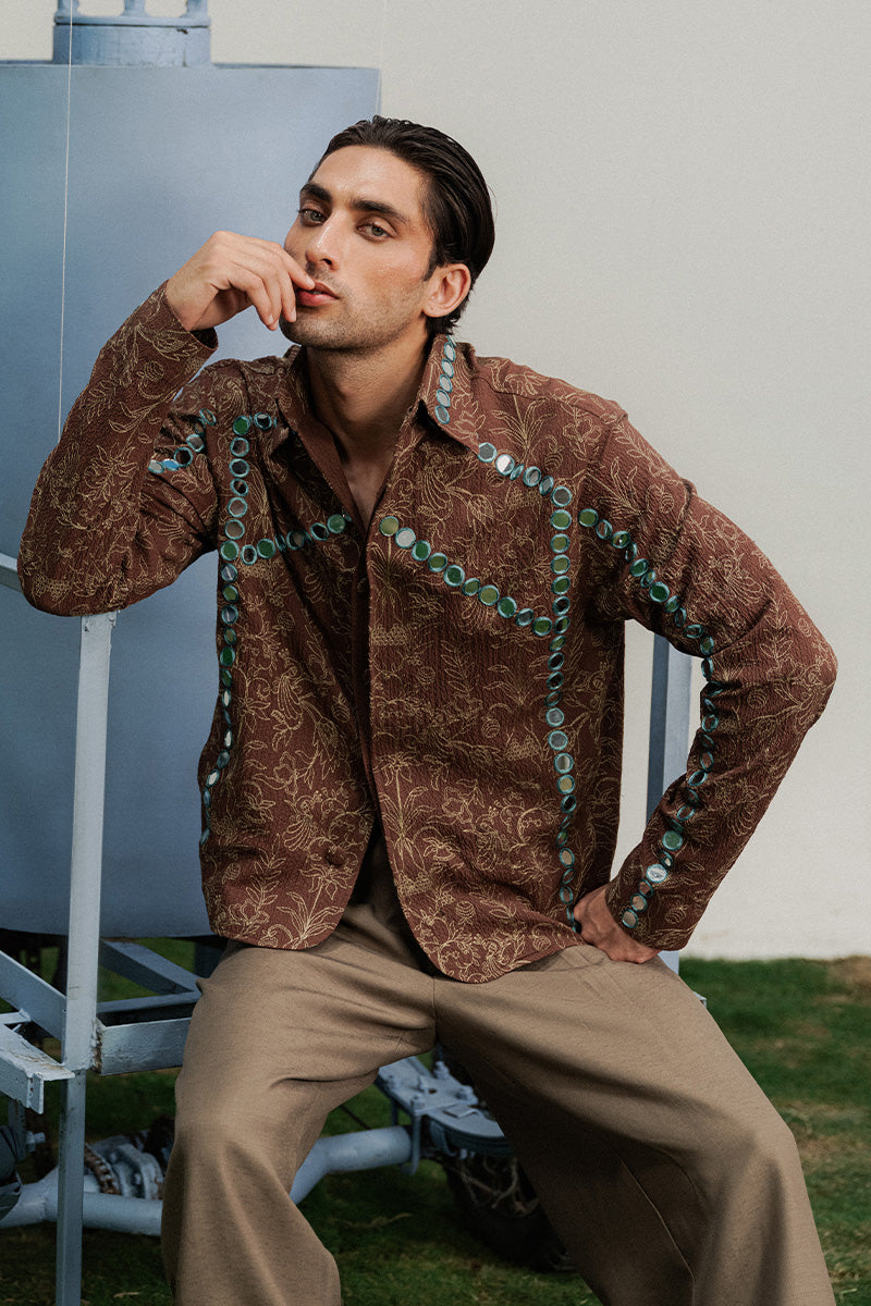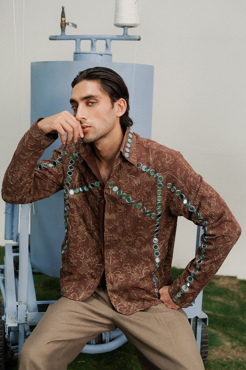 Lightweight, crinkled cotton with an all-over embroidery showcasing scenes from Aomi's mystic jungle and further adorned with hand embellished mirror-work on the collar, front, and sleeves; accentuated by cerulean blue thread work.