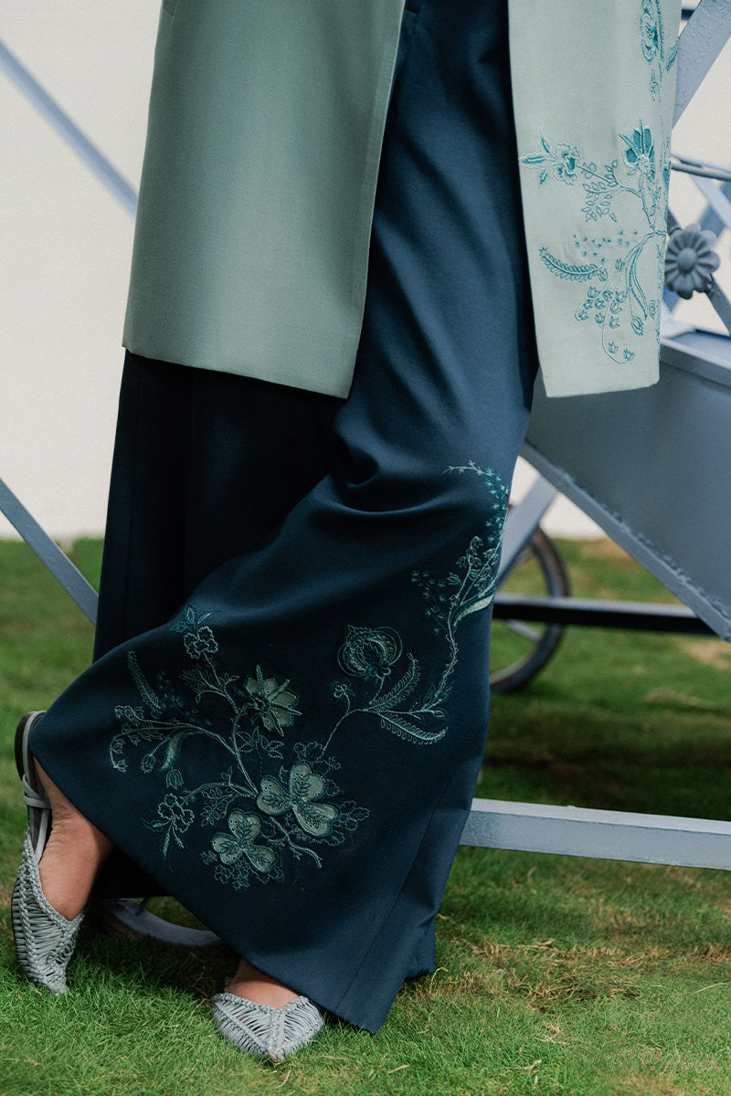 Add a touch of tradition to your wardrobe with these teal-colored trousers, tailored from wash and wear fabric for comfort and ease of care. The Marjan tailored trousers feature a striking floral pattern in contrasting embroidery, further accentuated with hand crafted appliqué and cord detailing design. Cut for a tailored, flared look.