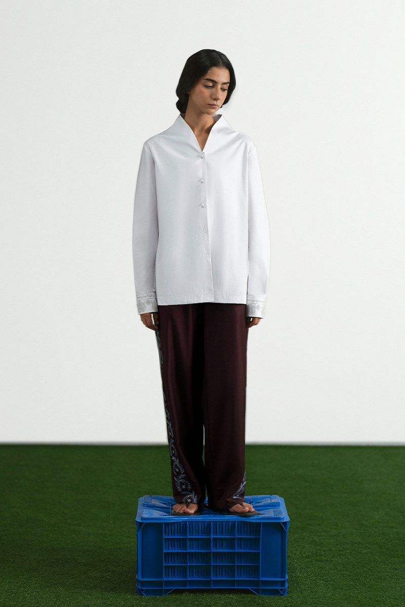 Aomi's take on the classic white shirt, the Yasmin shirt is a crisp tailored button down with a subtle slit detailing on the back, detailed with mono-tone thread embroidery. An elevated approach to every day dressing and an essential piece in your wardrobe.
