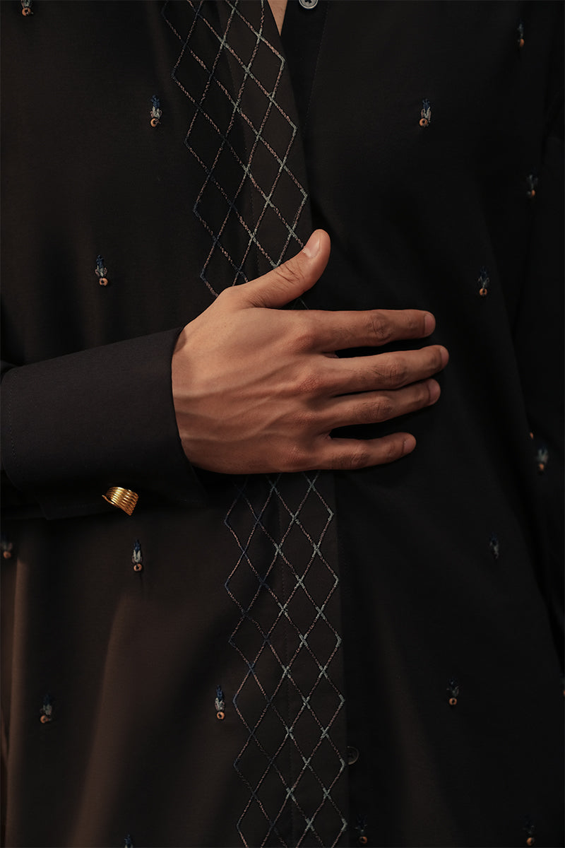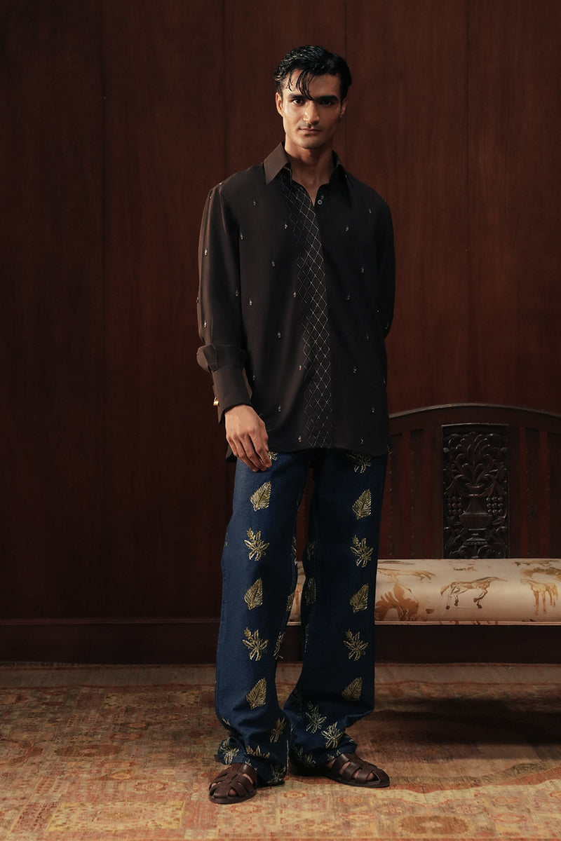 A tuxedo-inspired shirt in chocolate-toned silk, elevated with intertwined hand embroidery and scattered detailing in wooden sequins and fine threadwork. Finished with a concealed placket, structured collar, and double cuffs, it distills South Asian craft into a sharp, contemporary form.