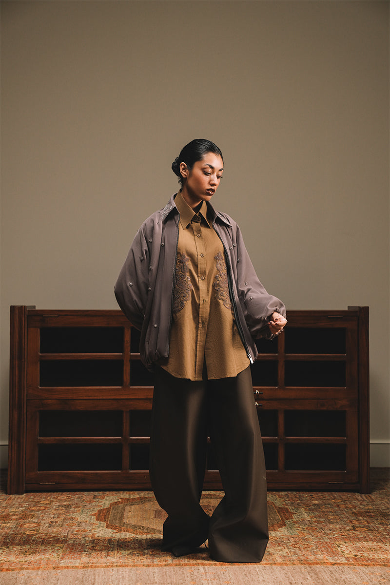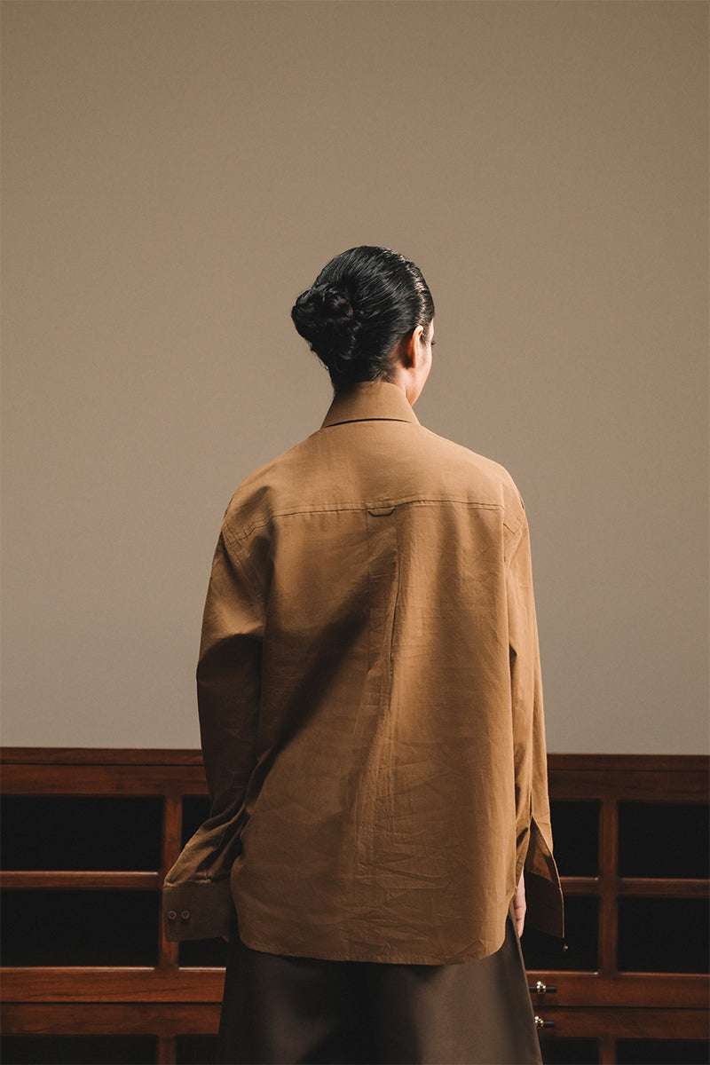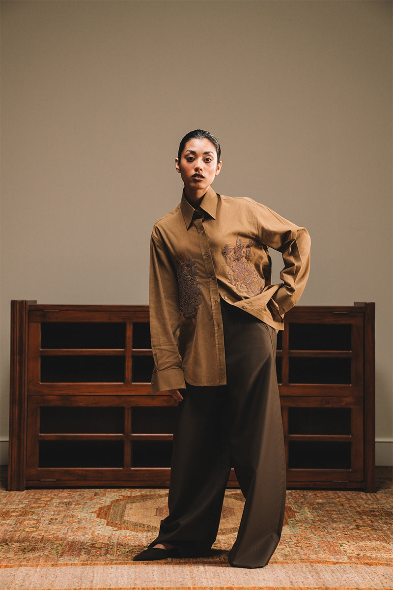 An effortless buttoned shirt in olive cotton, defined by hand-drawn, hand-crafted motifs. Cut with ease and fluidity, it carries a quiet balance of comfort and artistry.