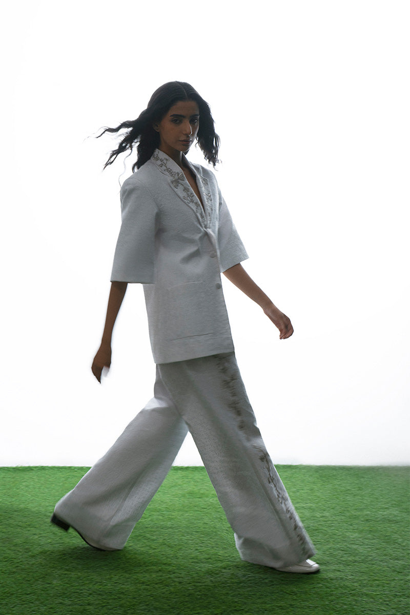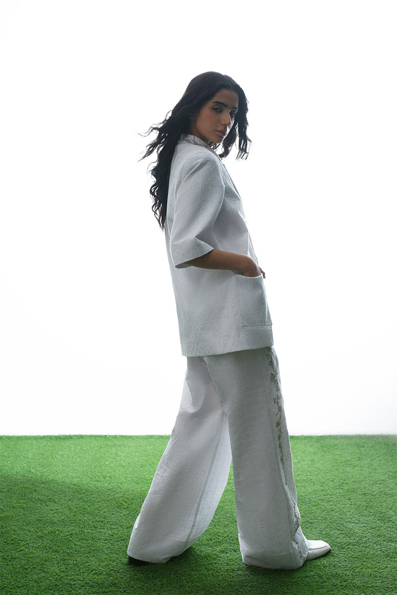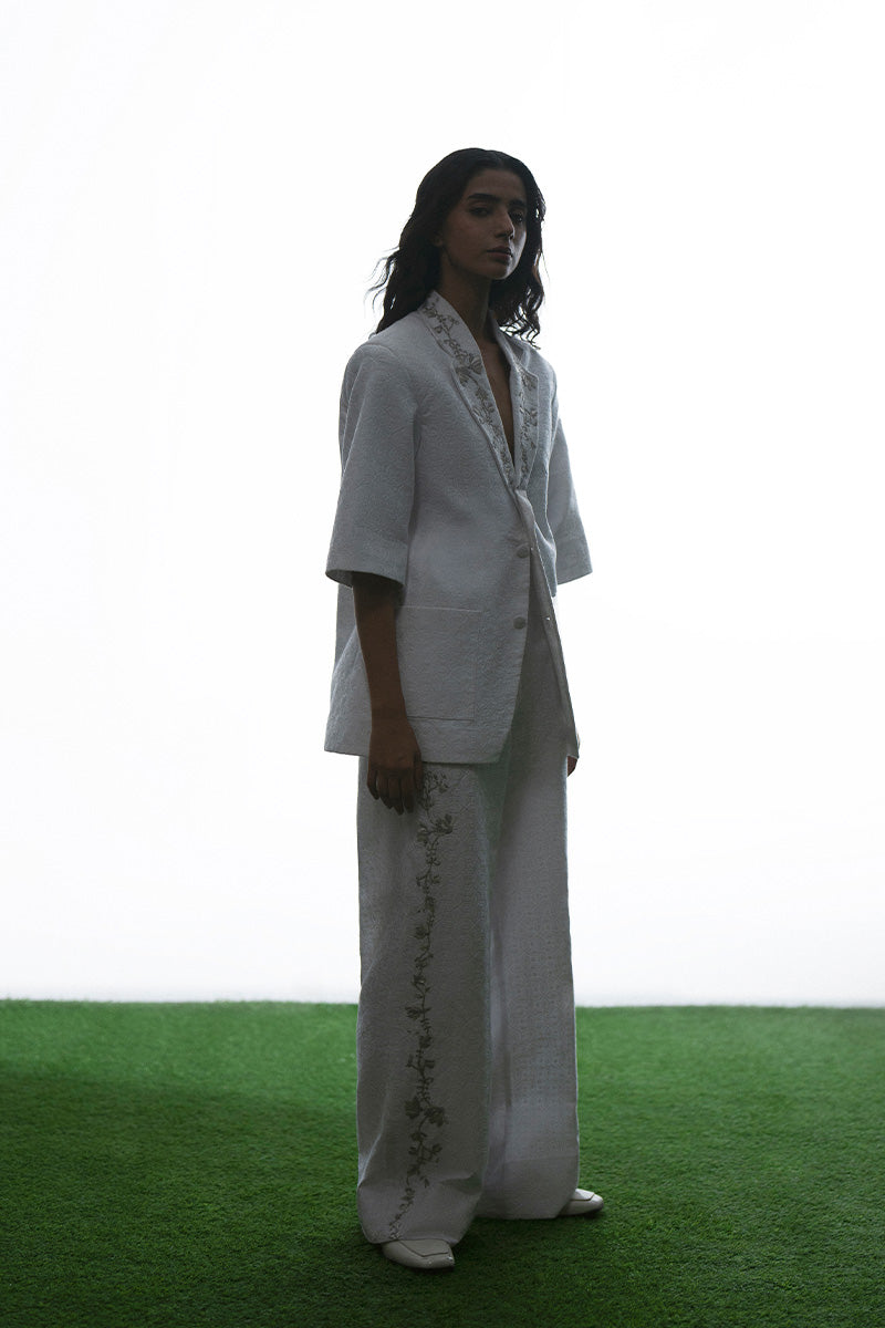 Tailored trousers in a crisp Chikankari fabric cut for a subtle bootcut feel for a relaxed, effortless look. A minimal version of the Zaver Embroidered Chikankari trouser.