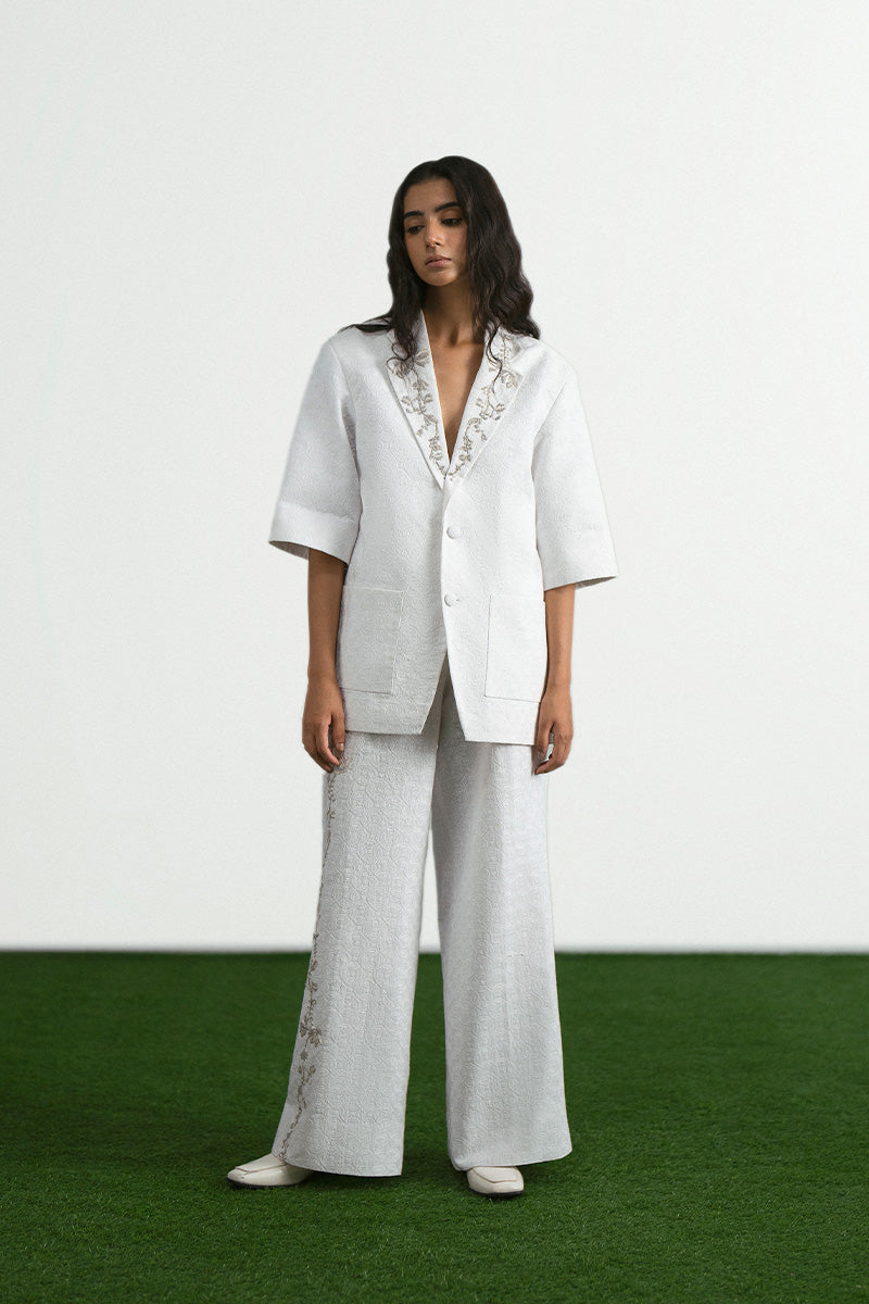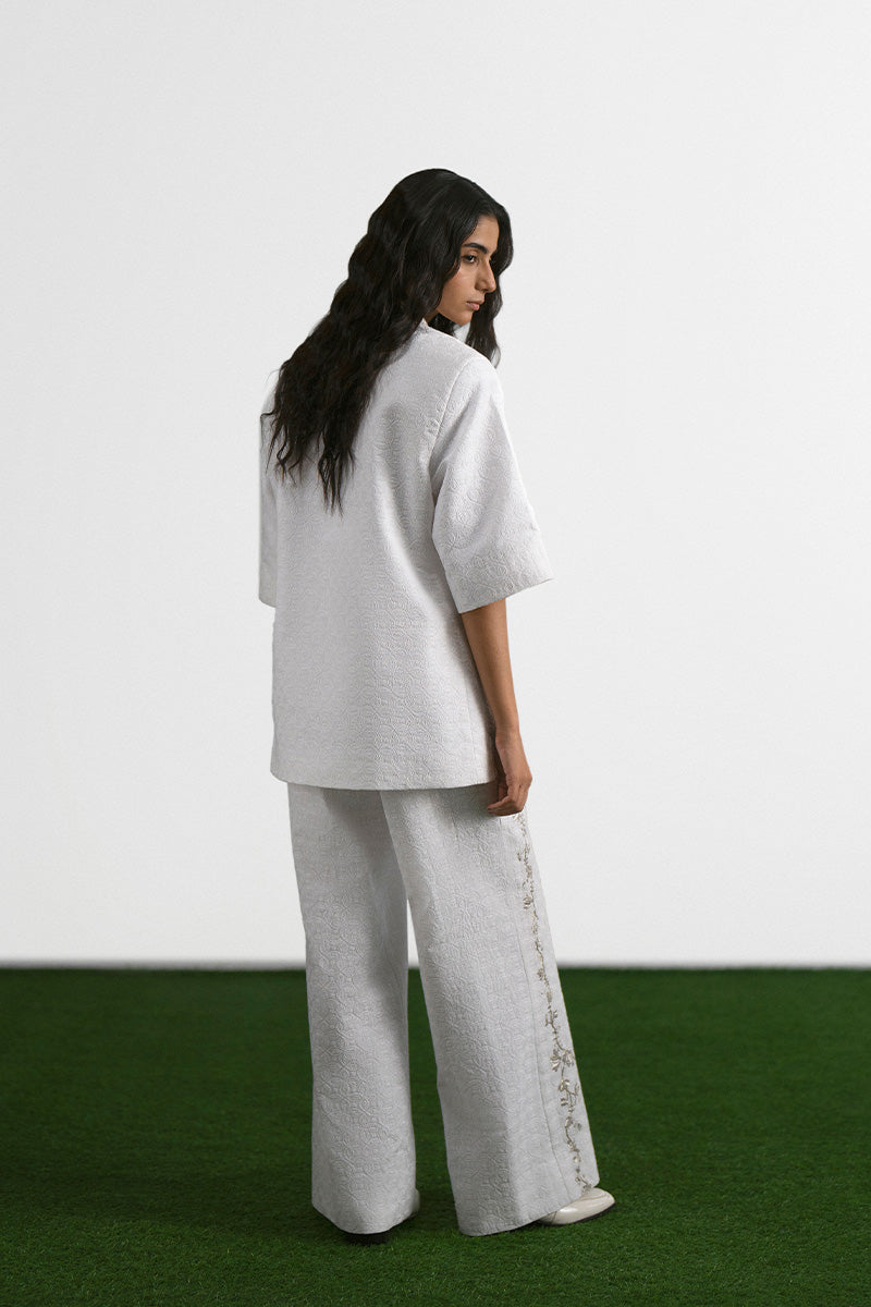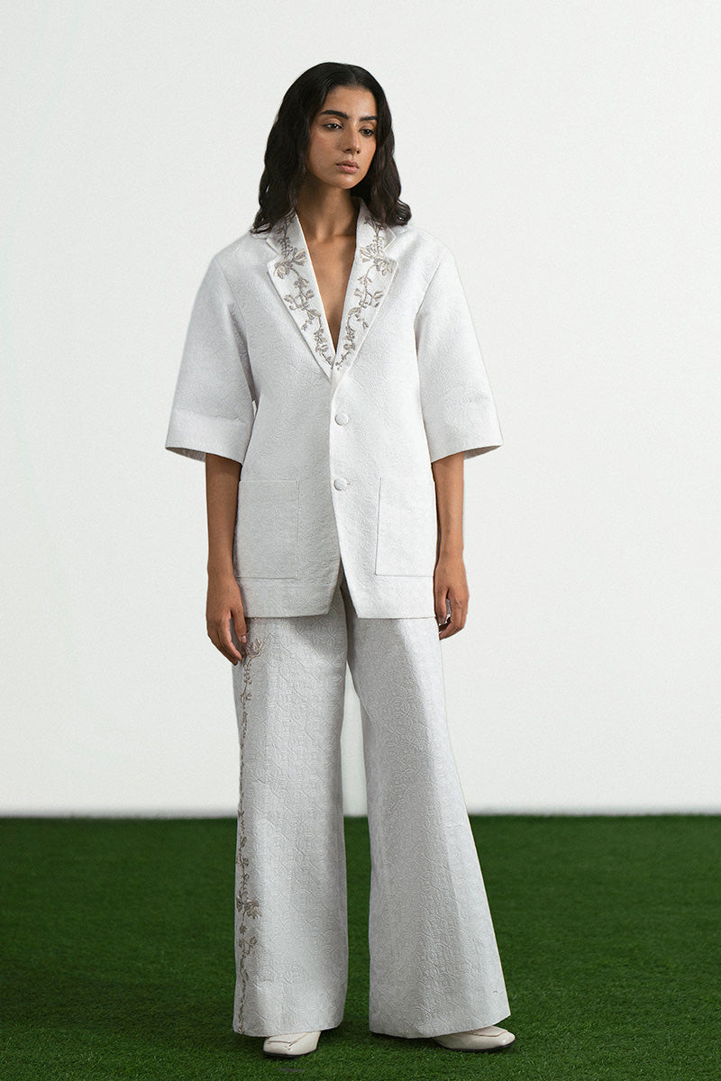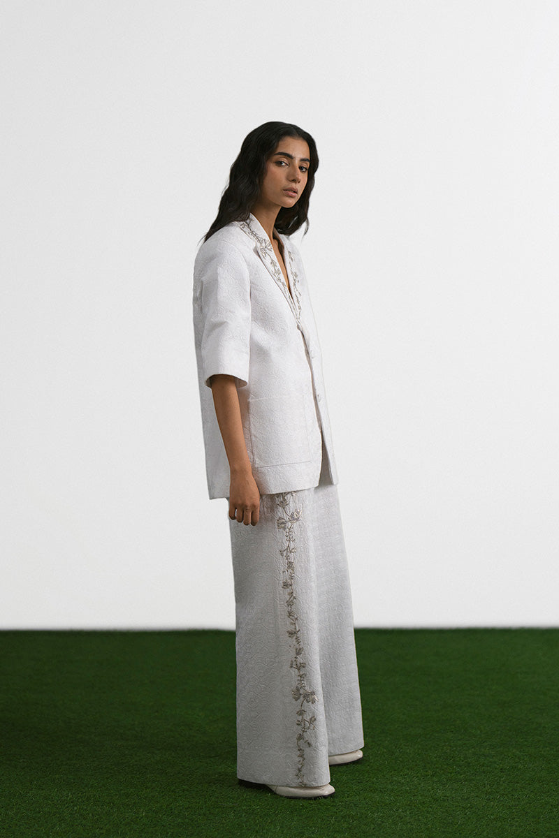 Tailored trousers in a crisp Chikankari fabric cut for a subtle bootcut feel for a relaxed, effortless look. A minimal version of the Zaver Embroidered Chikankari trouser.