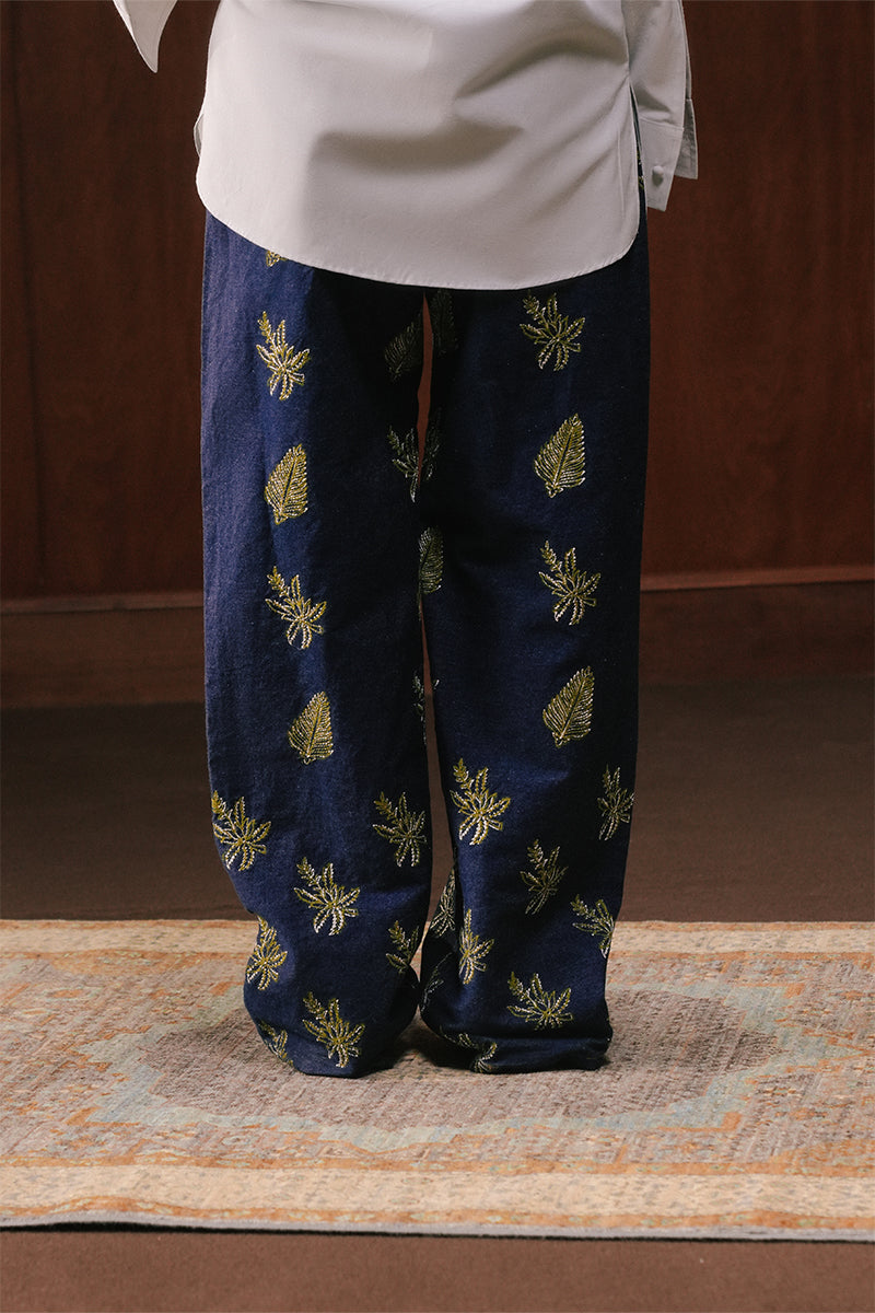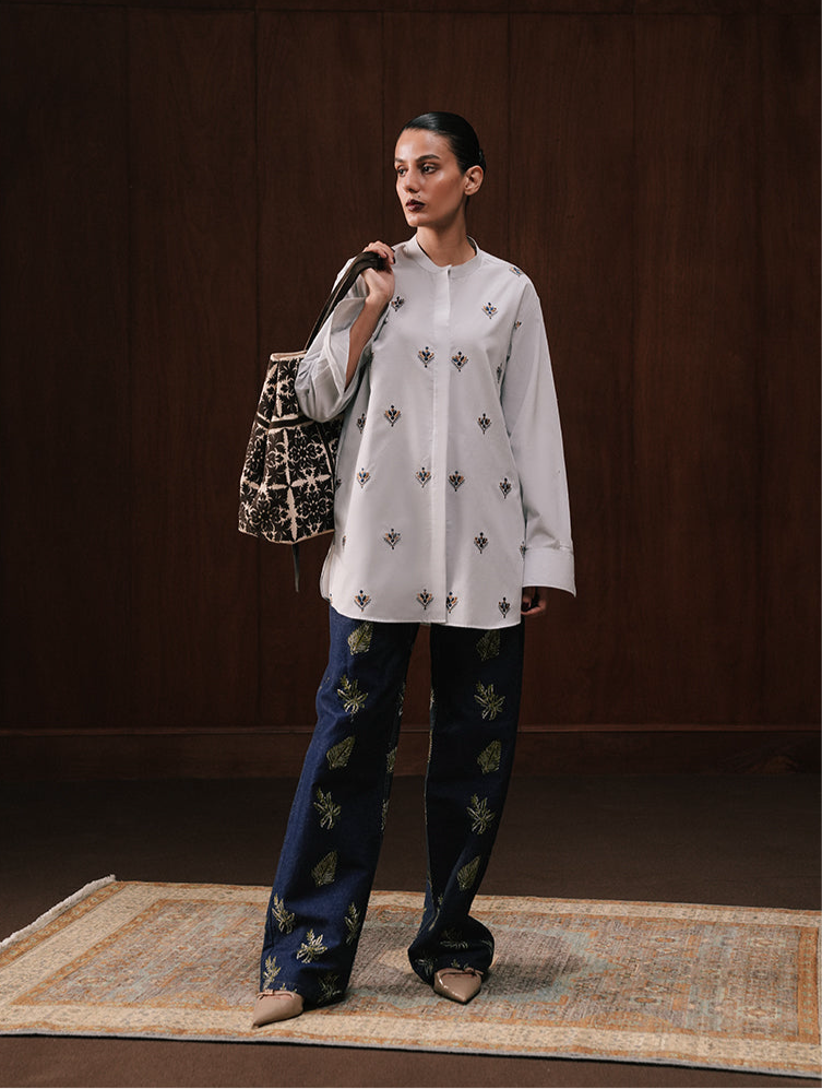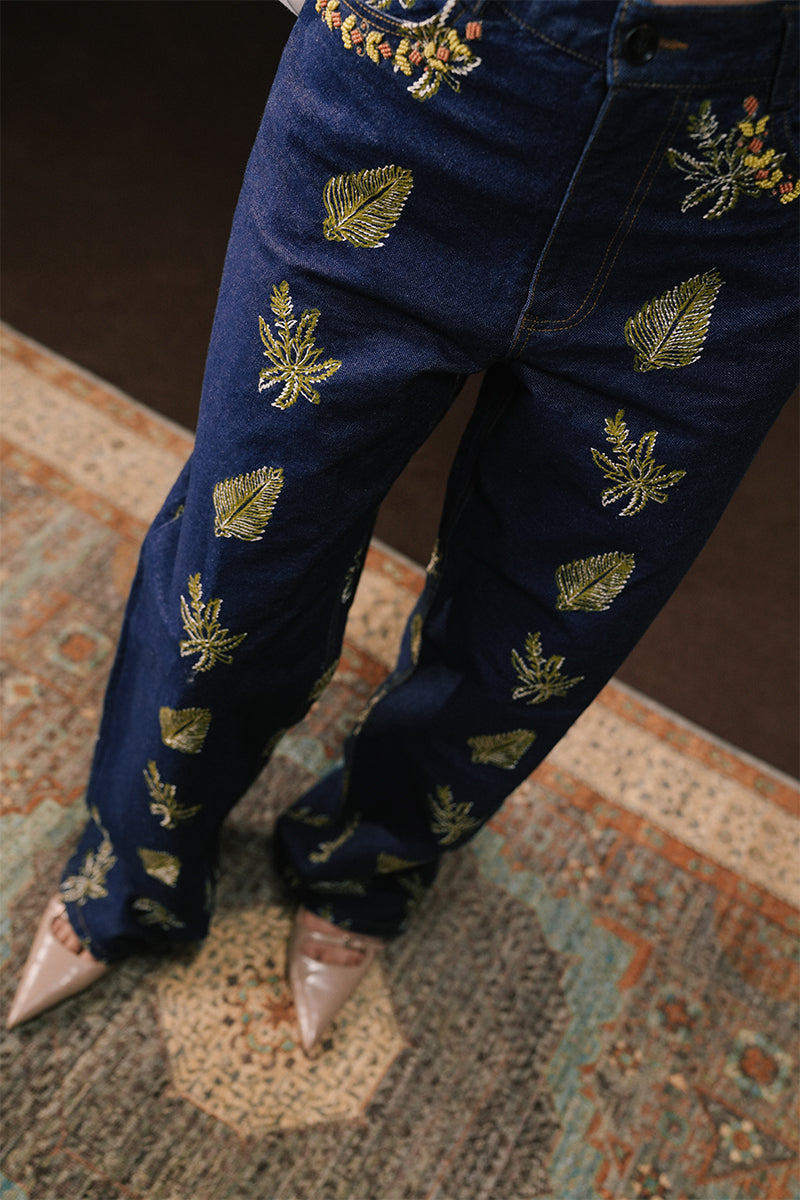 Straight-cut washed denim, elevated with hand-embroidered and block-printed motifs. Intricate beadwork traces the pocket edges, bringing artisanal beauty to a timeless silhouette.